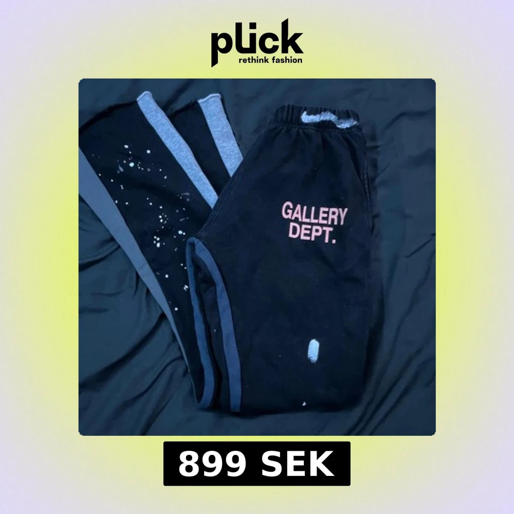 Svarta mjukisbyxor från Gallery Dept. med rosa tryck på framsidan och coola vita färgstänk längs benen. Byxorna har elastisk midja och grå sidopaneler som ger en schysst kontrast. Perfekta för en avslappnad streetwear-look.