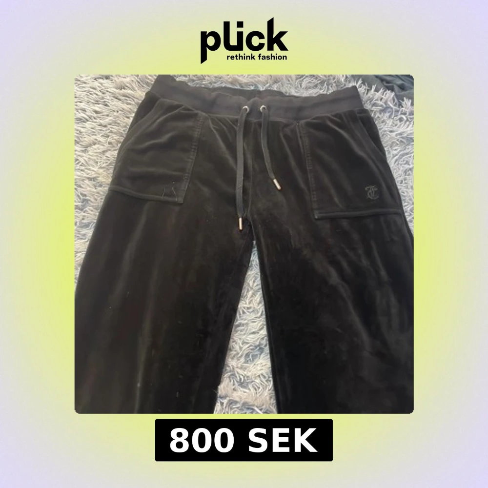 Svarta mjukisbyxor från Juicy Couture i storlek M. Byxorna har bred resår i midjan med snörning, och en diskret Juicy Couture-logga på ena fickan. Mjukt och glansigt sammetstyg som känns lyxigt och skönt.