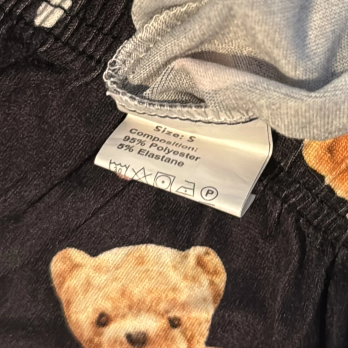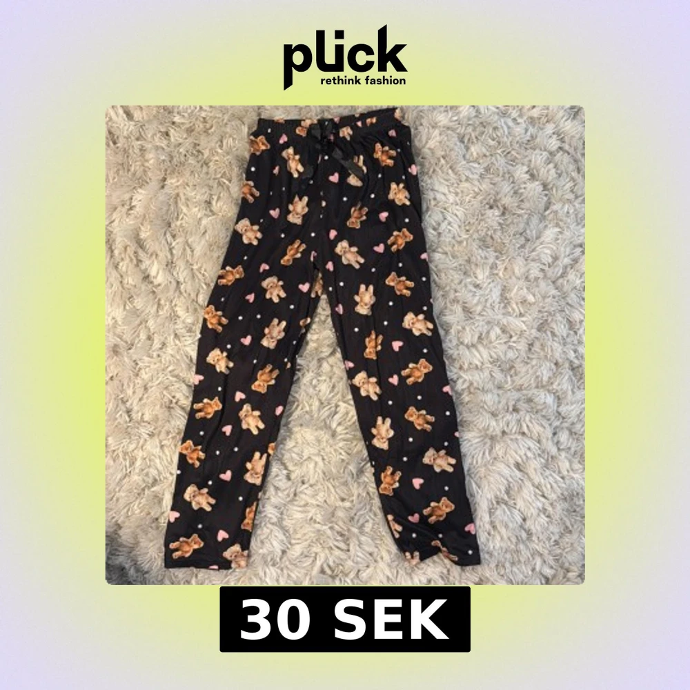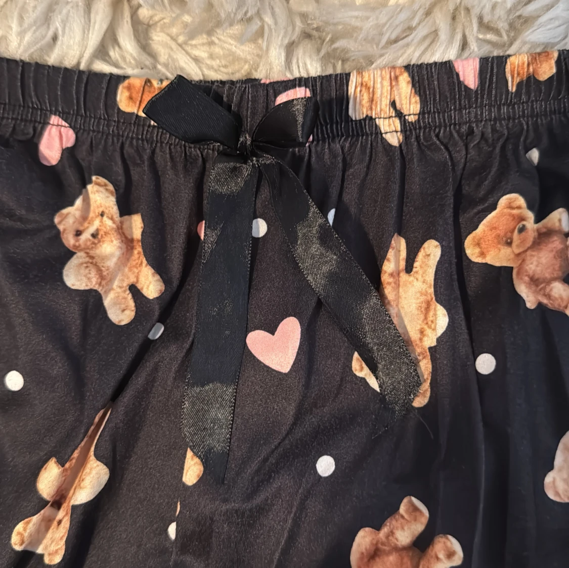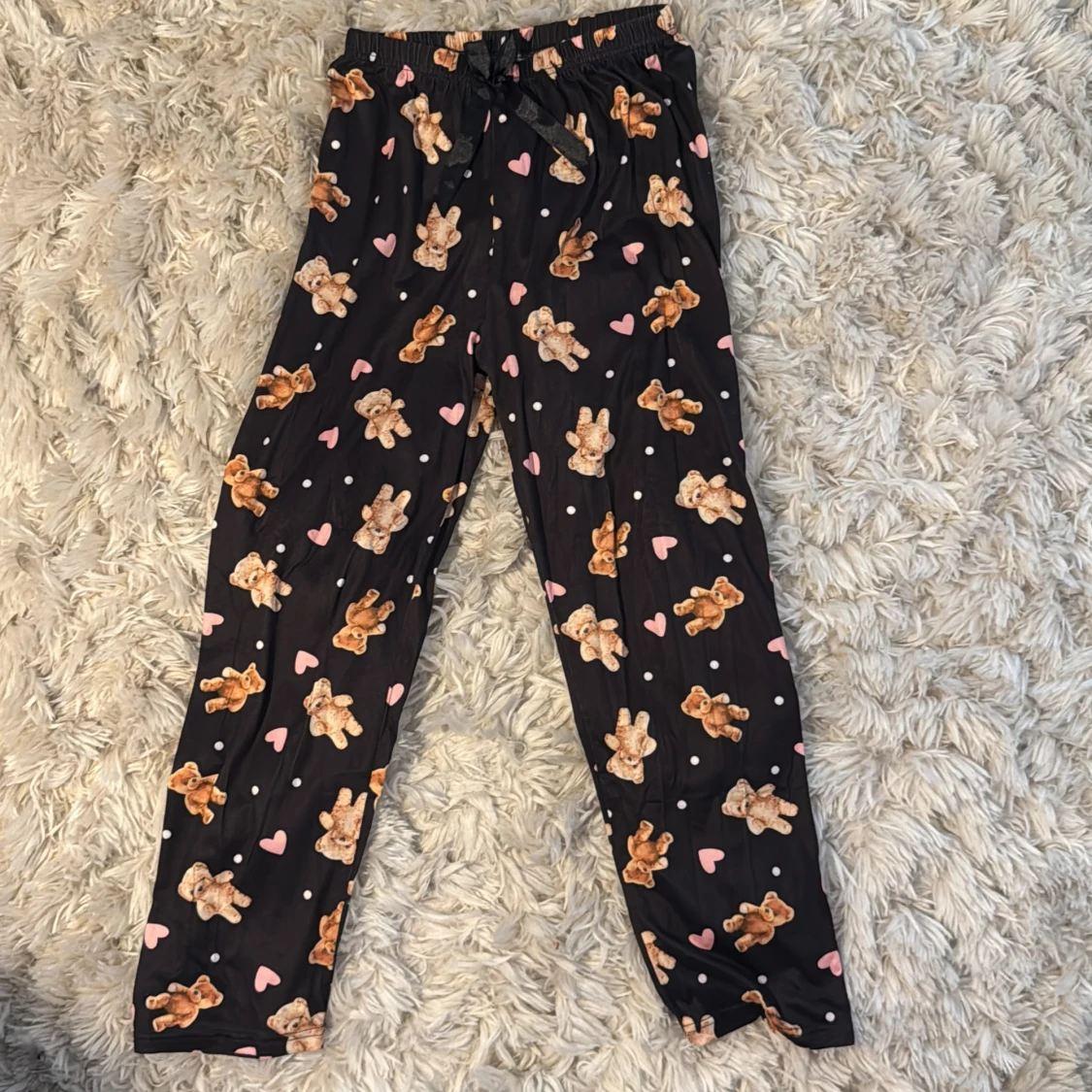Supergulliga svarta mjukisbyxor med tryck av nallar, rosa hjärtan och vita prickar. Byxorna har resår i midjan och en svart rosett framtill. Tillverkade i mjuk polyester med lite stretch för extra komfort. Perfekta för chill dagar hemma.