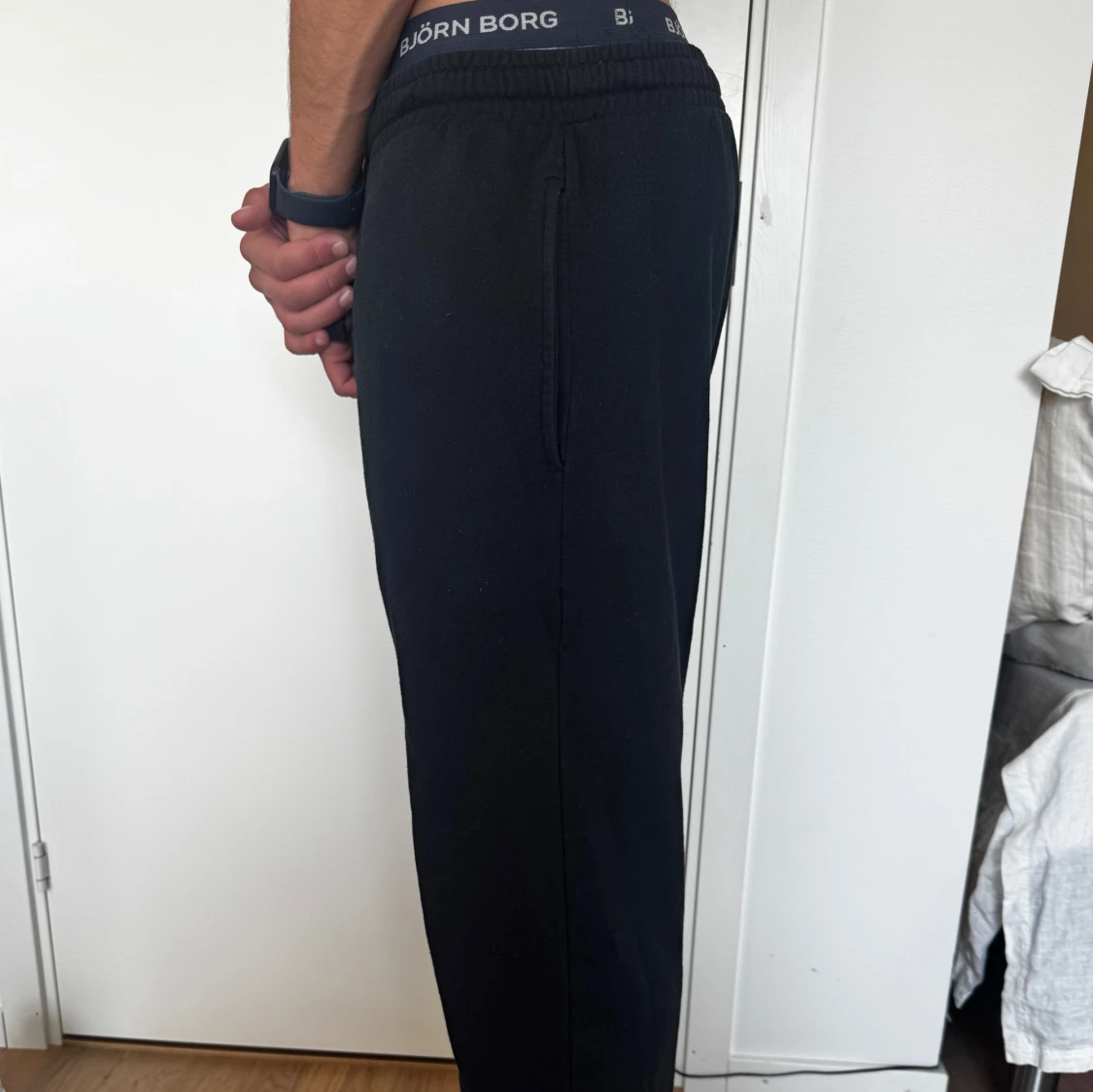 Svarta mjukisbyxor med elastisk midja och snörning. Byxorna har raka ben och sidofickor, perfekta för chill dagar eller träning. Tillverkade i mjukt bomullsmaterial för maximal komfort.
