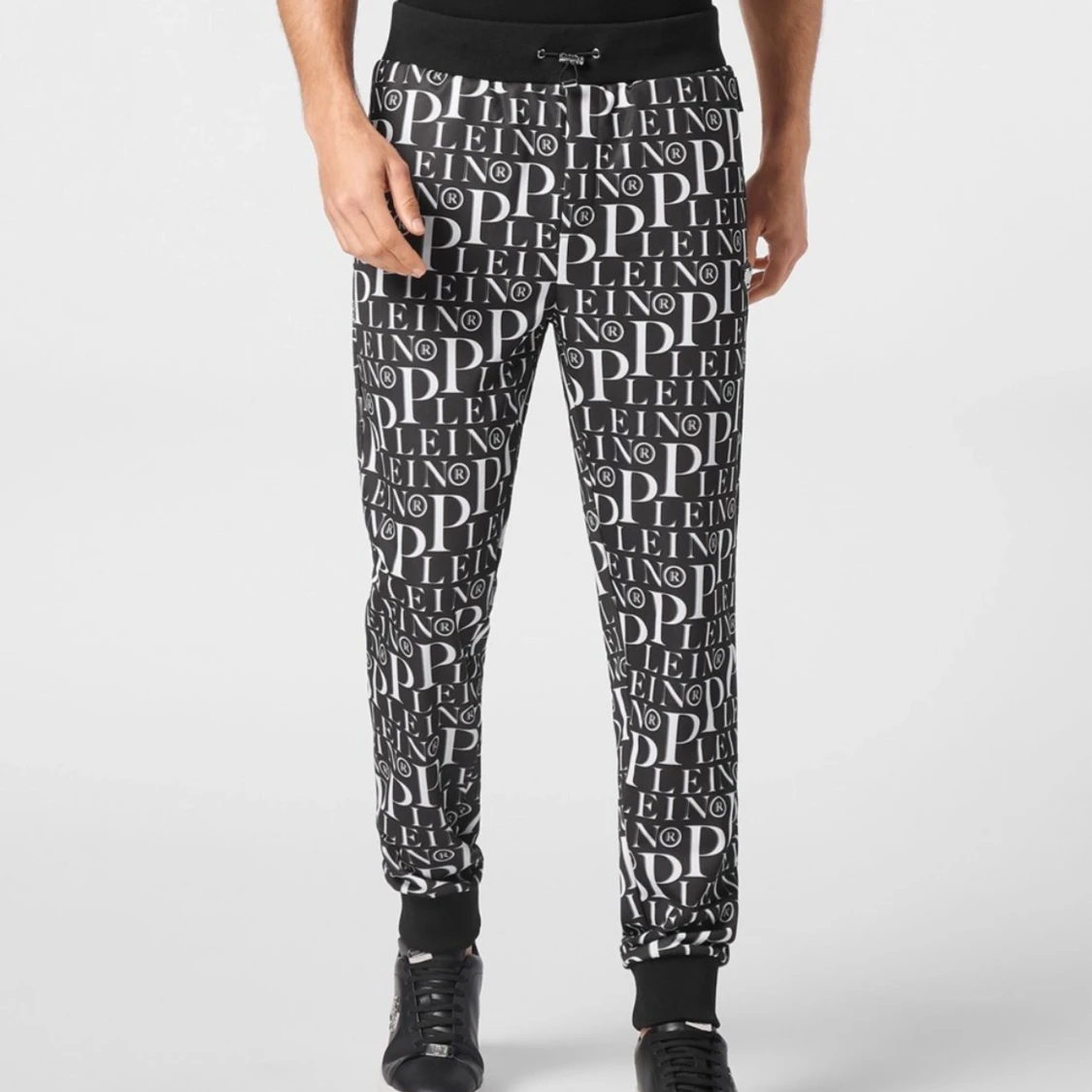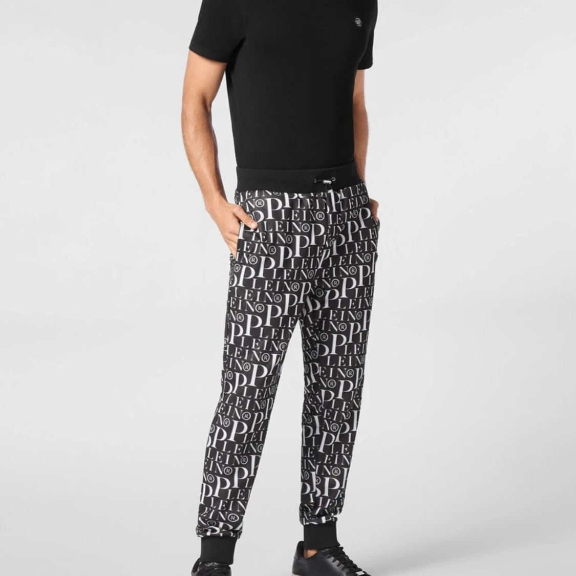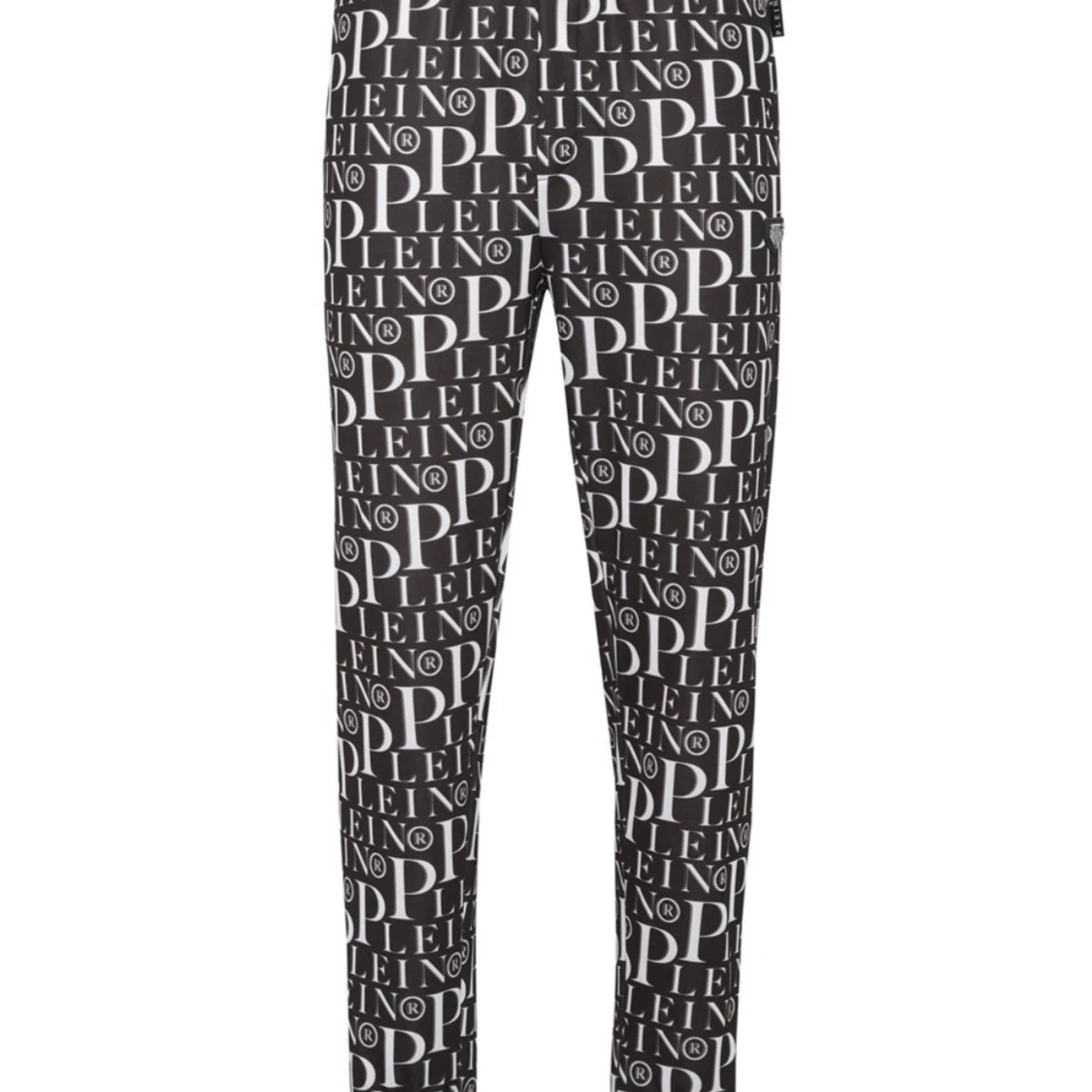Säljer ett par svarta Phillip Plein mjukisbyxor med en fet vit logotyp över hela tyget. De har en elastisk midja med snörning och muddar vid bensluten. Perfekta för en avslappnad stil eller chill hemma. Superbekväma och stiliga!