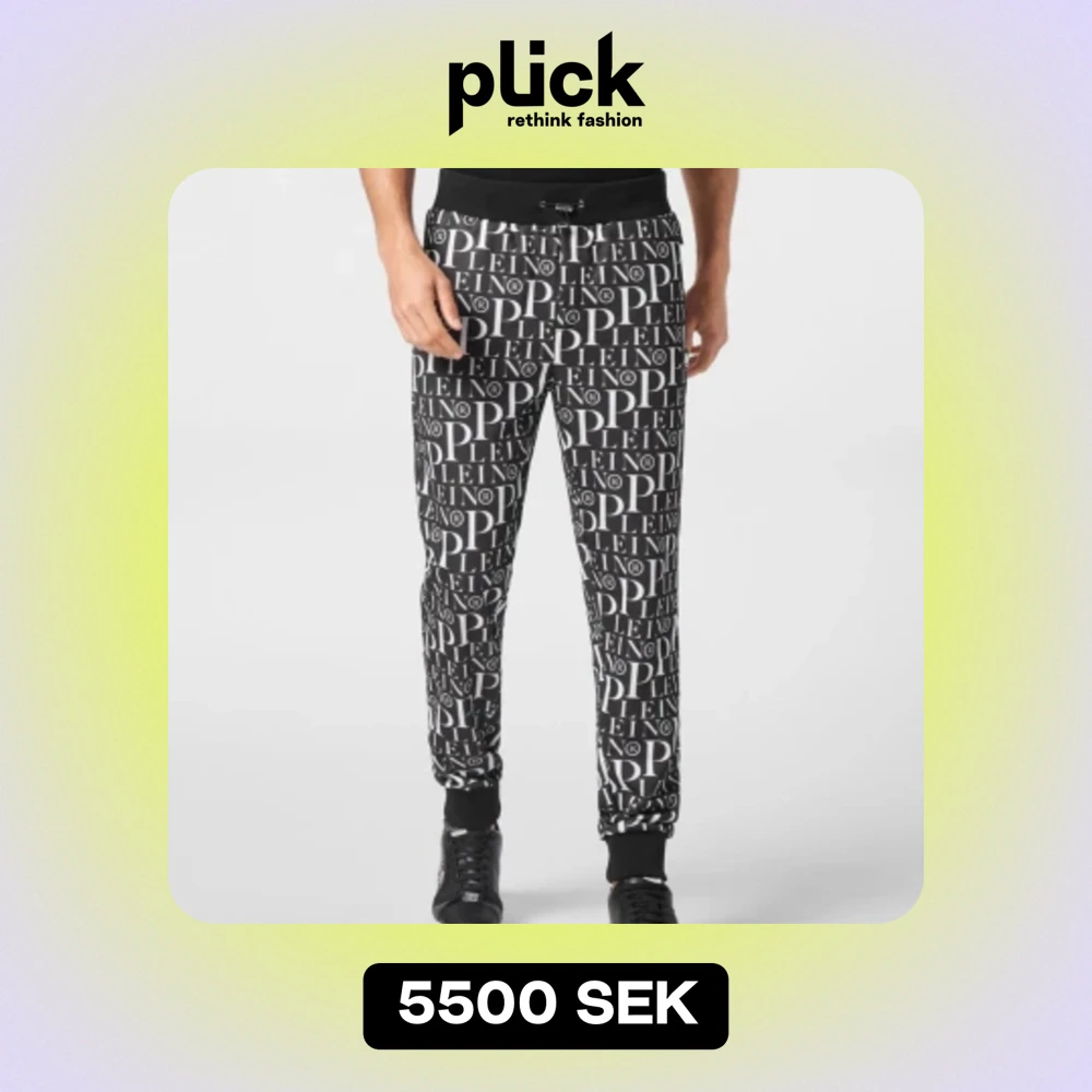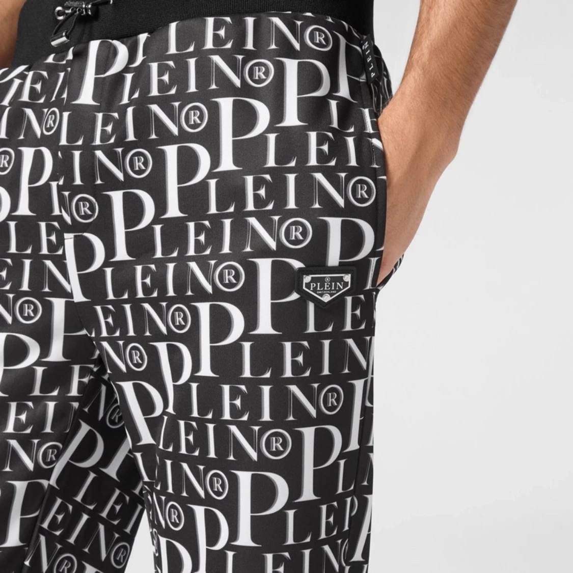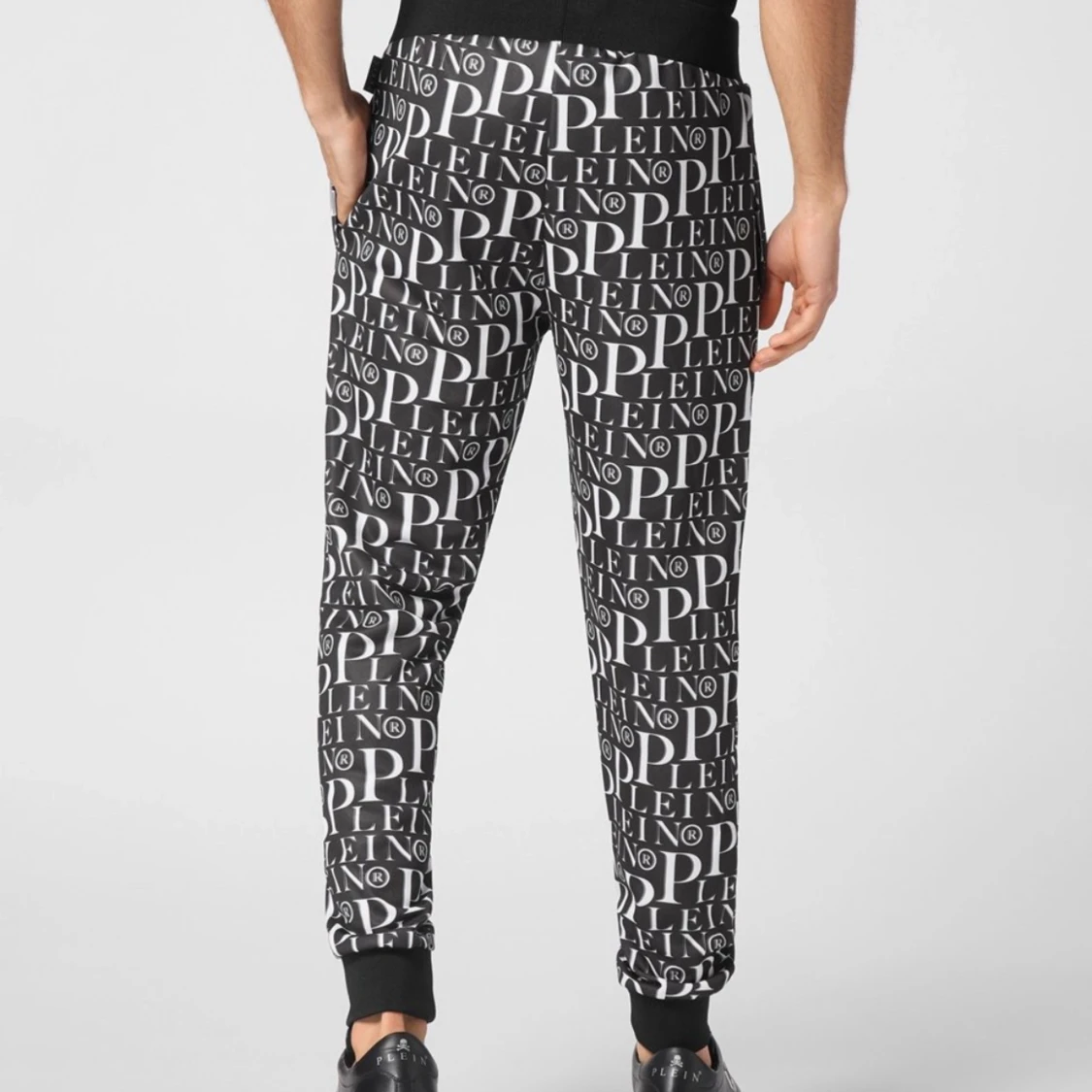 Säljer ett par svarta Phillip Plein mjukisbyxor med en fet vit logotyp över hela tyget. De har en elastisk midja med snörning och muddar vid bensluten. Perfekta för en avslappnad stil eller chill hemma. Superbekväma och stiliga!