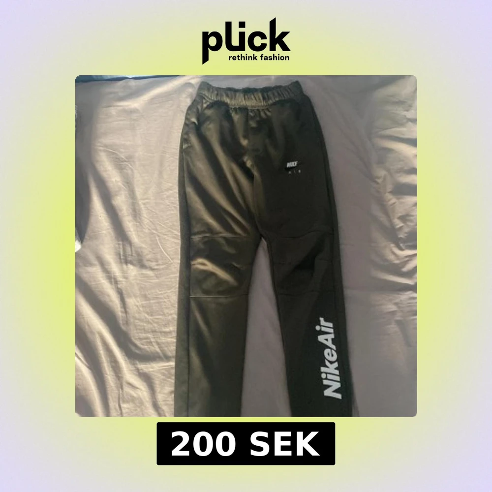 Säljer ett par svarta mjukisbyxor från Nike Air med vit logga längs benet och broderad Nike Air-detalj vid fickan. Byxorna har resår i midjan och är i standard fit, perfekta för en sportig look.