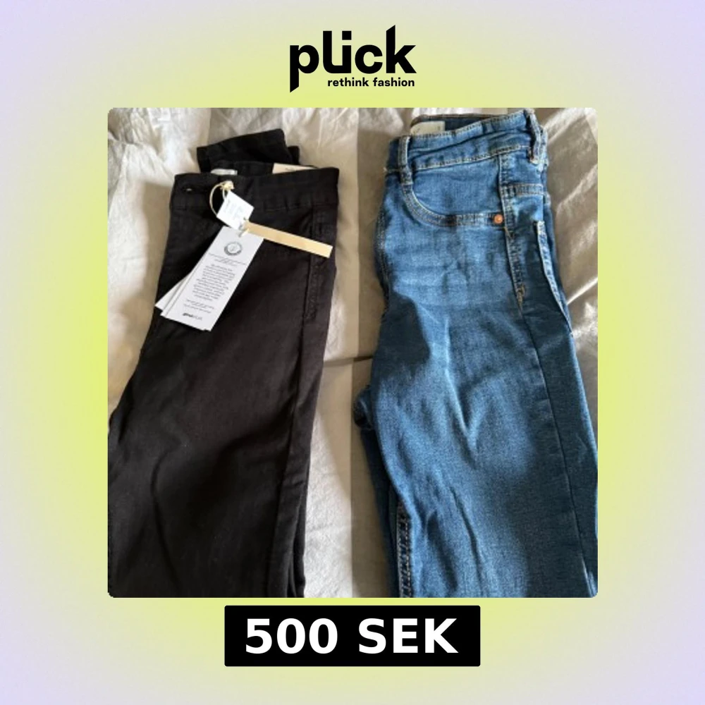 Två par jeans från Pieces. Ett par svarta Molly petite high waist jeans och ett par klassiska blå jeans. Båda har en snygg och enkel design med femficksmodell och knappgylf. Perfekta för en stilren look. Nya, de blåa använda några timmar.