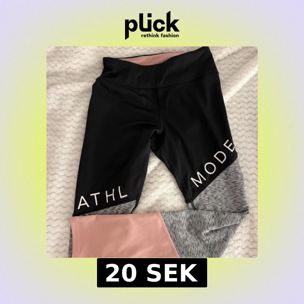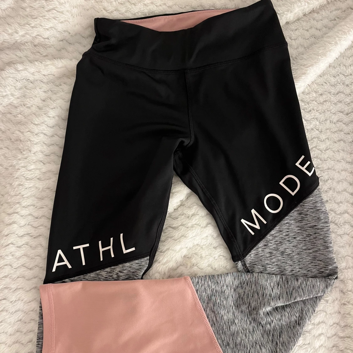 Snygga leggings från H&M i svart och grått med rosa detaljer. Perfekta för träning med en bekväm passform och elastisk midja. Texten 'ATHL MODE' pryder benen för en sportig look.