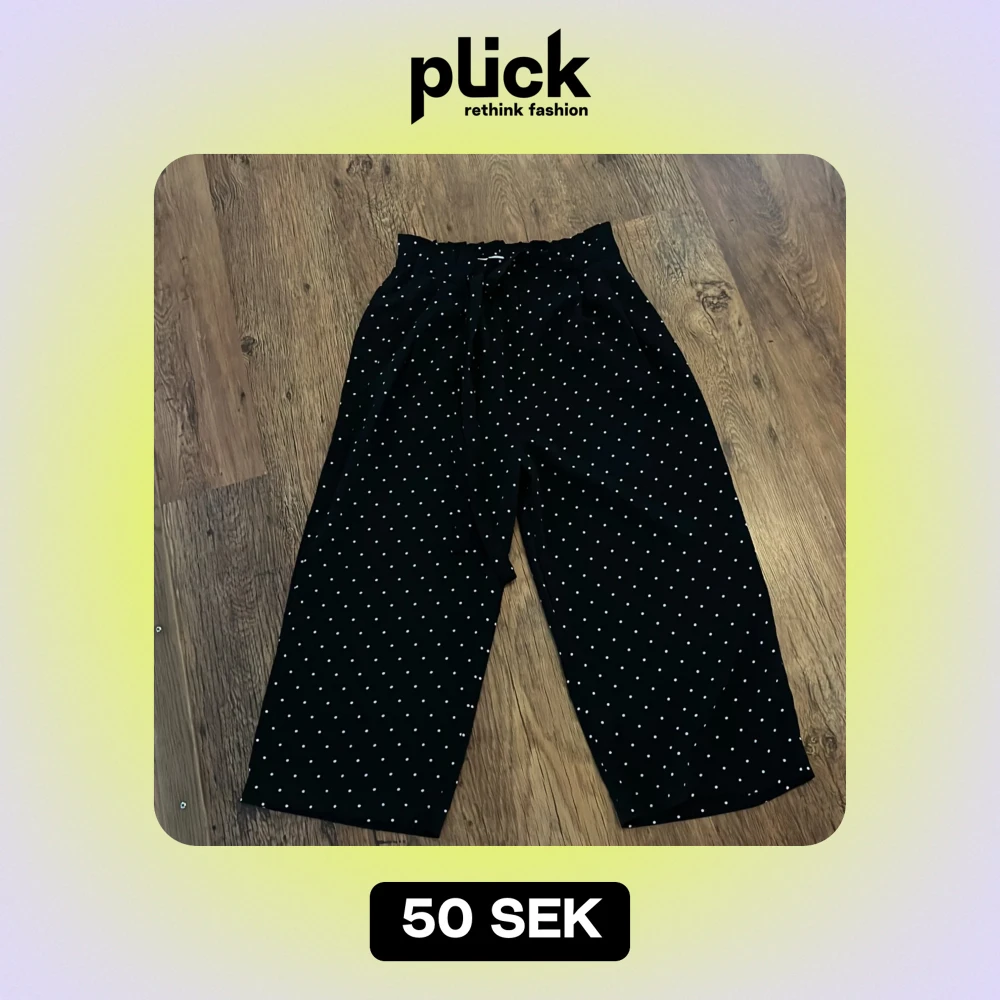Säljer ett par svarta byxor med vita prickar och ett snyggt knytband i midjan. Byxorna har en loose passform och är perfekta för både vardag och fest. De är högmidjade och ger en chic look. Materialet känns mjukt och bekvämt, perfekt för alla säsonger. Bara att dra på och ha när du går runt i hemmet.