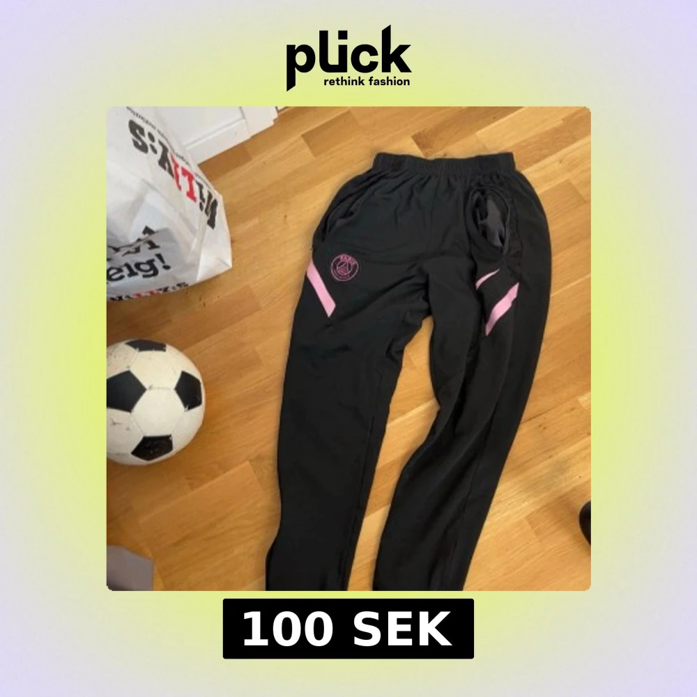 Säljer ett par svarta PSG träningsbyxor från Nike i storlek M. Byxorna har rosa detaljer och PSG-logga på ena benet, samt elastisk midja och fickor. Perfekta för fotboll eller chill. Materialet är polyester och har en loose passform. Storlek m men passar för s