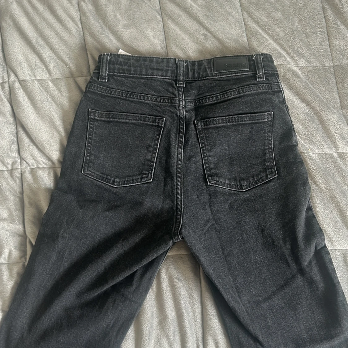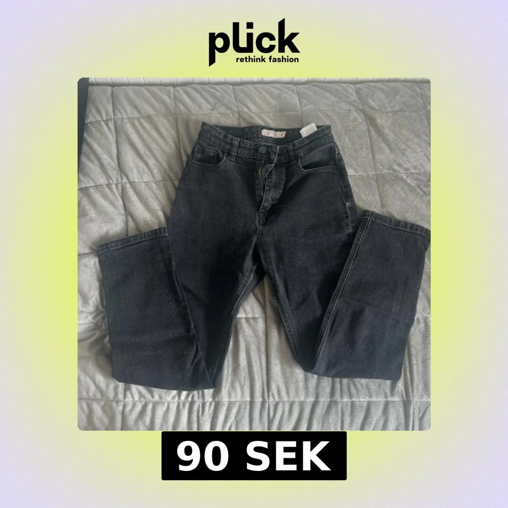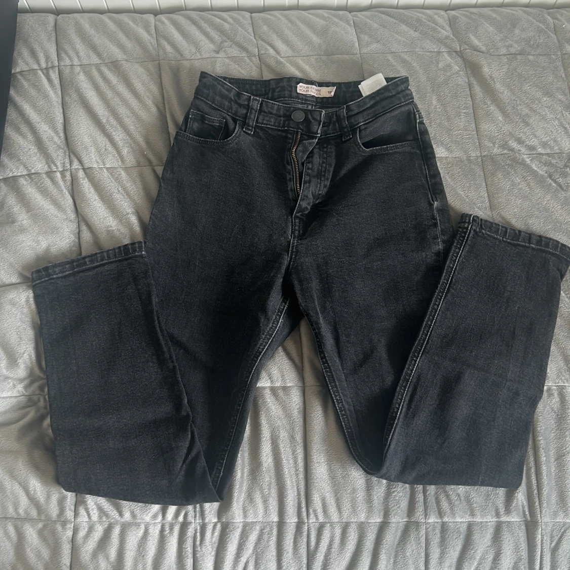 Säljer ett par svarta jeans med rak passform och klassisk femficksdesign. Byxorna har hög midja och stängs med dragkedja och knapp. Perfekta till vardags för en stilren look.