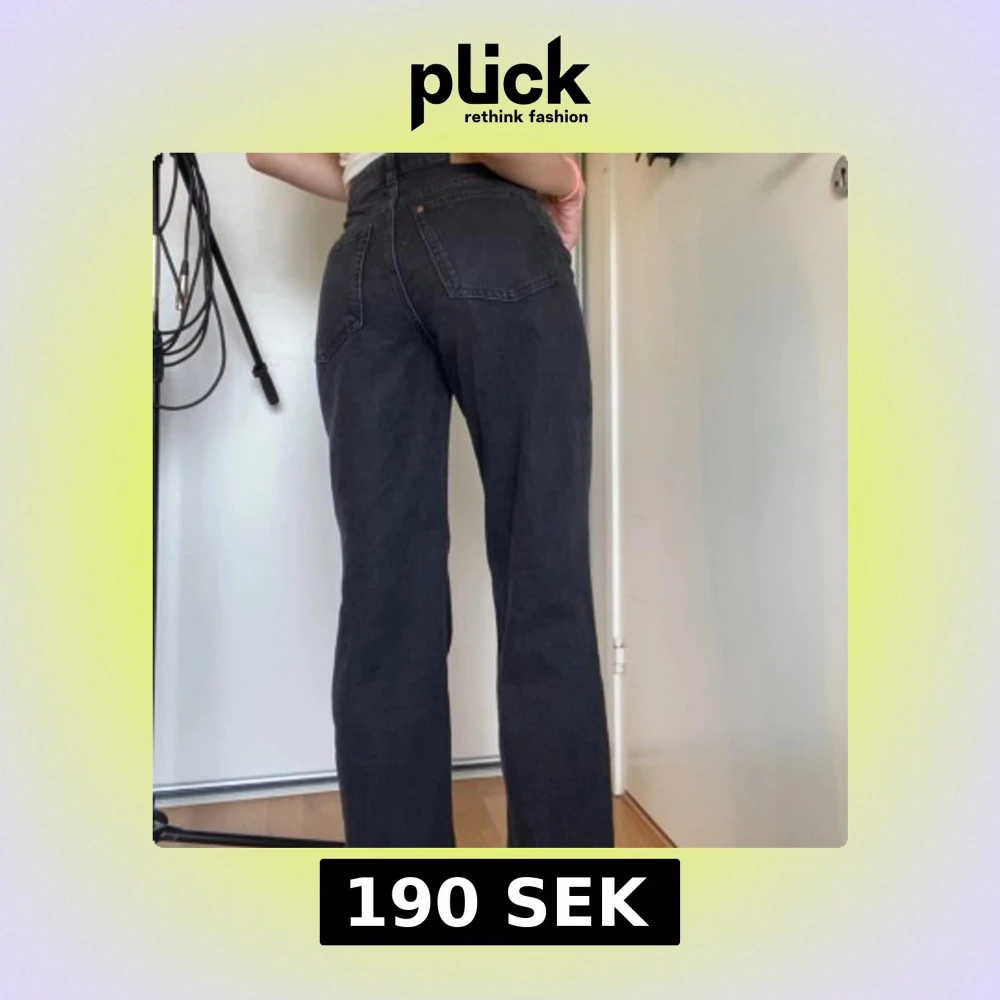 Säljer ett par svarta H&M jeans med hög midja och raka ben. Jeansen har klassiska bakfickor och är tillverkade i kraftigt denimtyg. Perfekta för dig som gillar en clean och tidlös look.