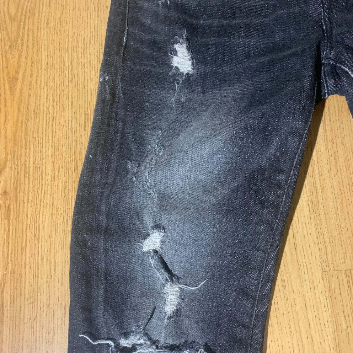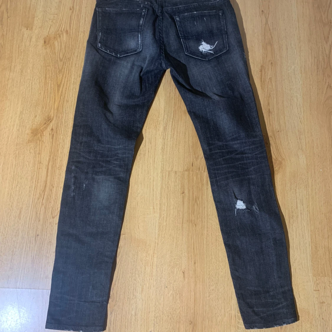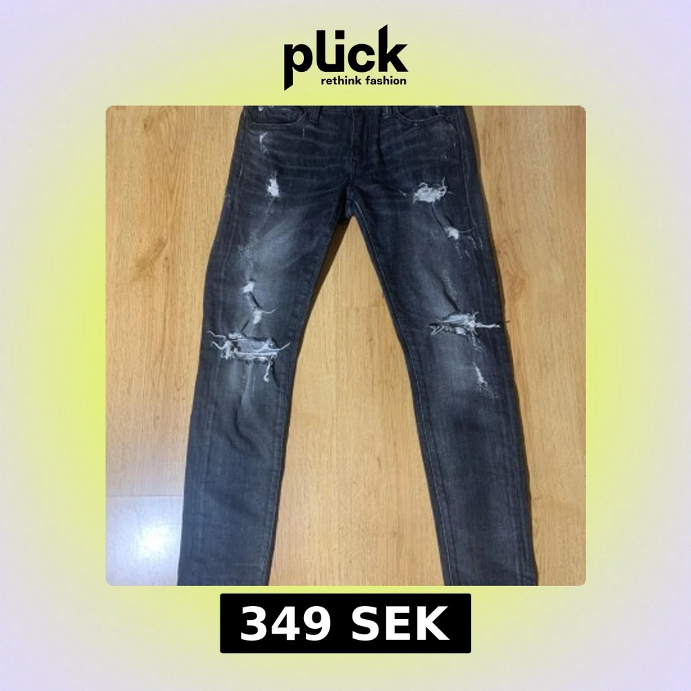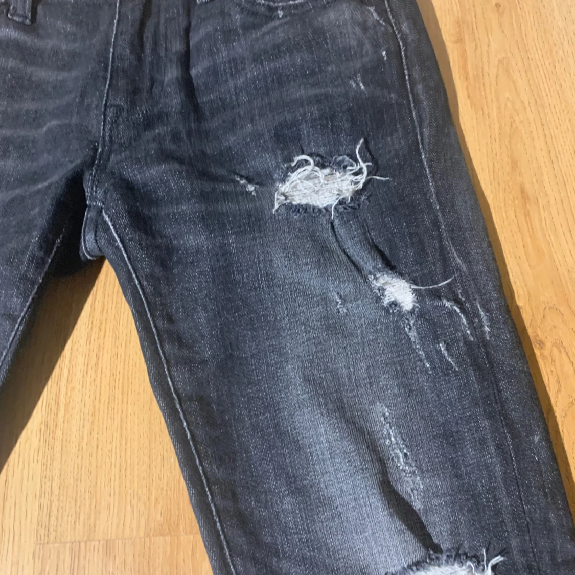 Snygga svarta jeans med slitningar och hål för en trendig look. De har en skinny passform och är perfekta för en avslappnad stil. Jeansen har klassisk femficksdesign och är tillverkade i denim. Märke Ralph luarean storlek 158-164