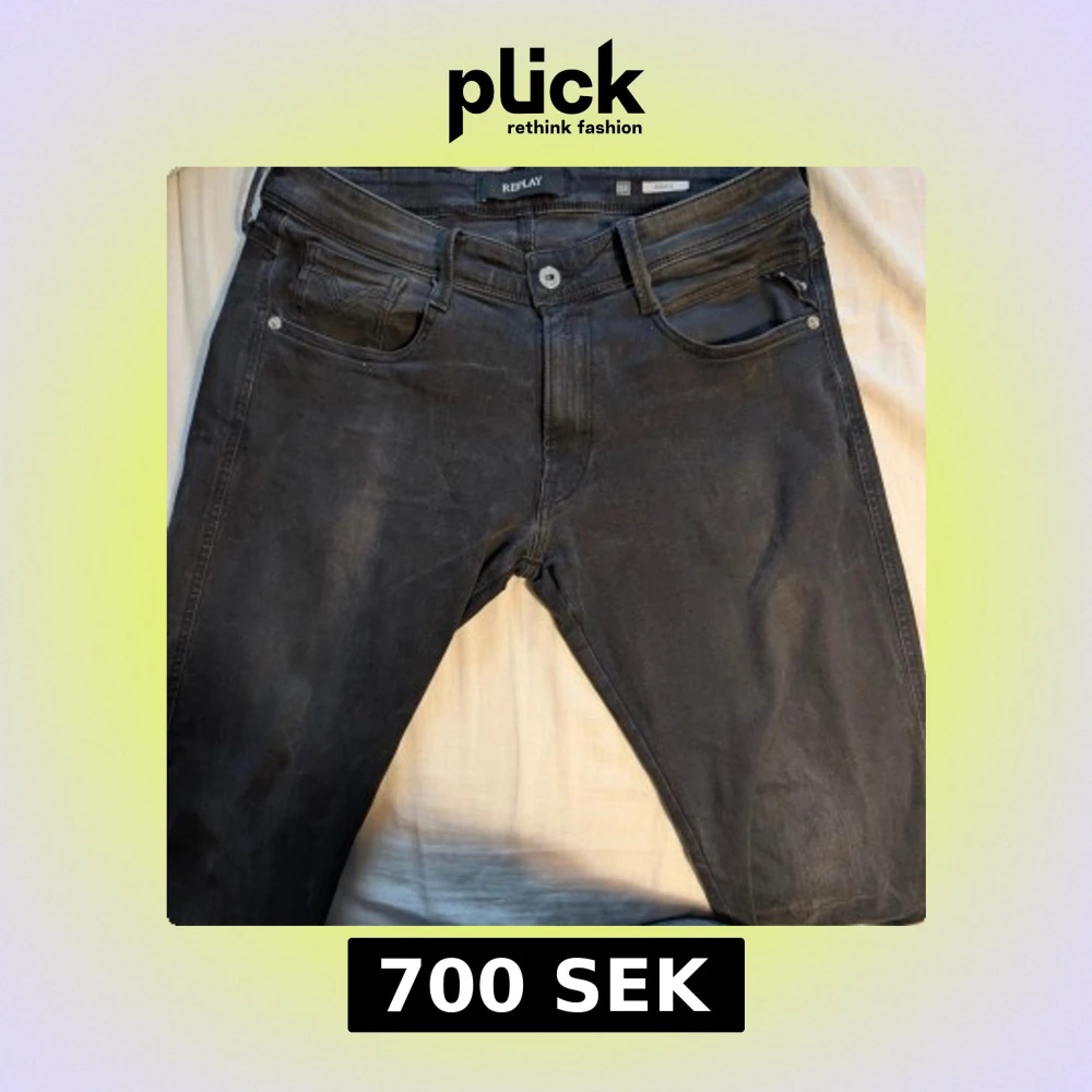 Säljer ett par svarta Replay Anbass jeans med klassisk femficksdesign och snygga detaljer på bakfickorna. Jeansen har en smal passform och är tillverkade i stretchigt jeansmaterial för extra komfort. Perfekta för dig som gillar stilrena och moderna jeans.