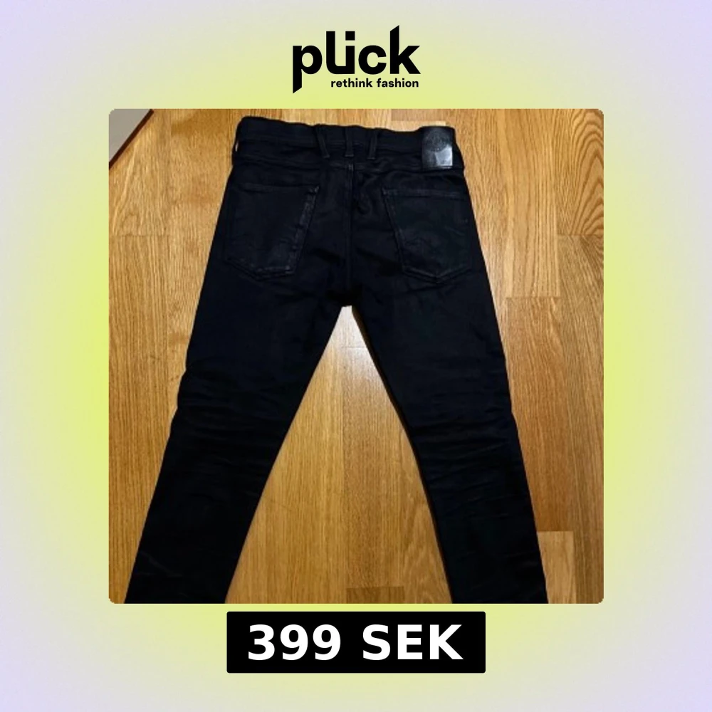 Säljer ett par svarta Replay Anbass jeans med slim passform och klassisk femficksdesign. Jeansen har svarta sömmar, Replay-logga på bakfickan och läderpatch i midjan. Materialet är stretchigt jeans för skön komfort och snygg siluett.