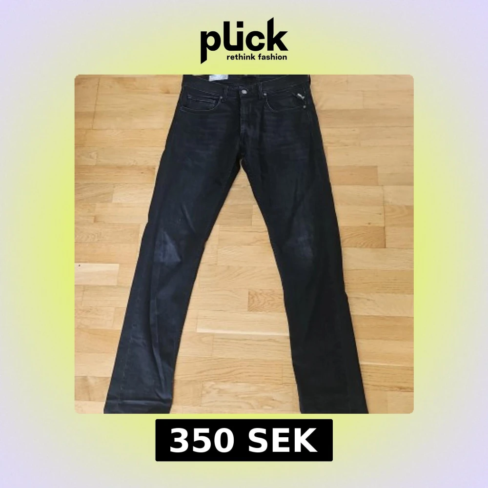 Säljer ett par svarta Replay Grover jeans med klassisk femficksdesign och diskreta slitningar. Jeansen har raka ben och normal passform, med logotyp på bakfickan och läderpatch i midjan. Perfekta för dig som gillar stilrena jeans.