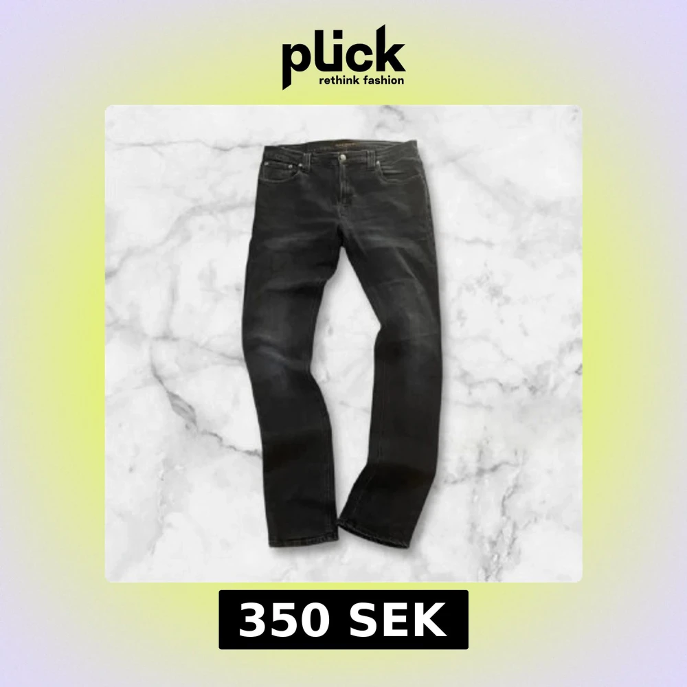 Tja det är ett par riktigt snygga Nudie jeans modell slim fit💫 Nypris kostar de 1600kr✅Skicket ligger på en 8/10✨Storleken är 34/34 men den ör väldigt liten i storlek. Vid fundering är det bara att höra av sig💫