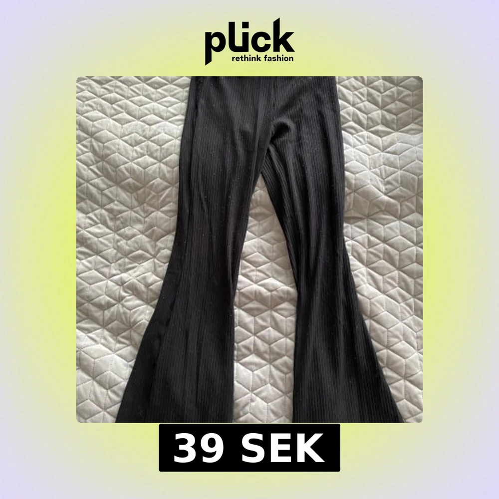 Svarta ribbade byxor från H&M i storlek 158. Byxorna har bootcut-modell med utsvängda ben och är tillverkade i ett stretchigt, mjukt material. Perfekta för en chill och trendig look.