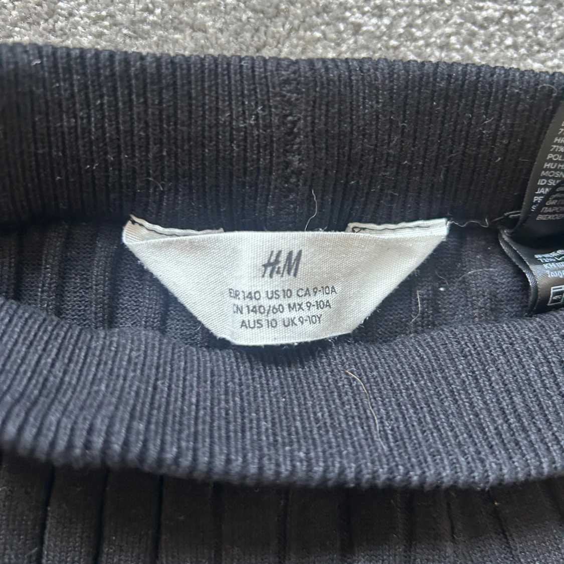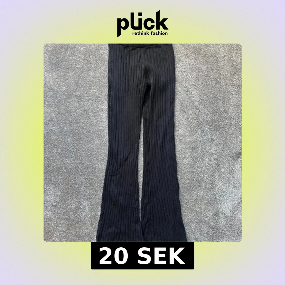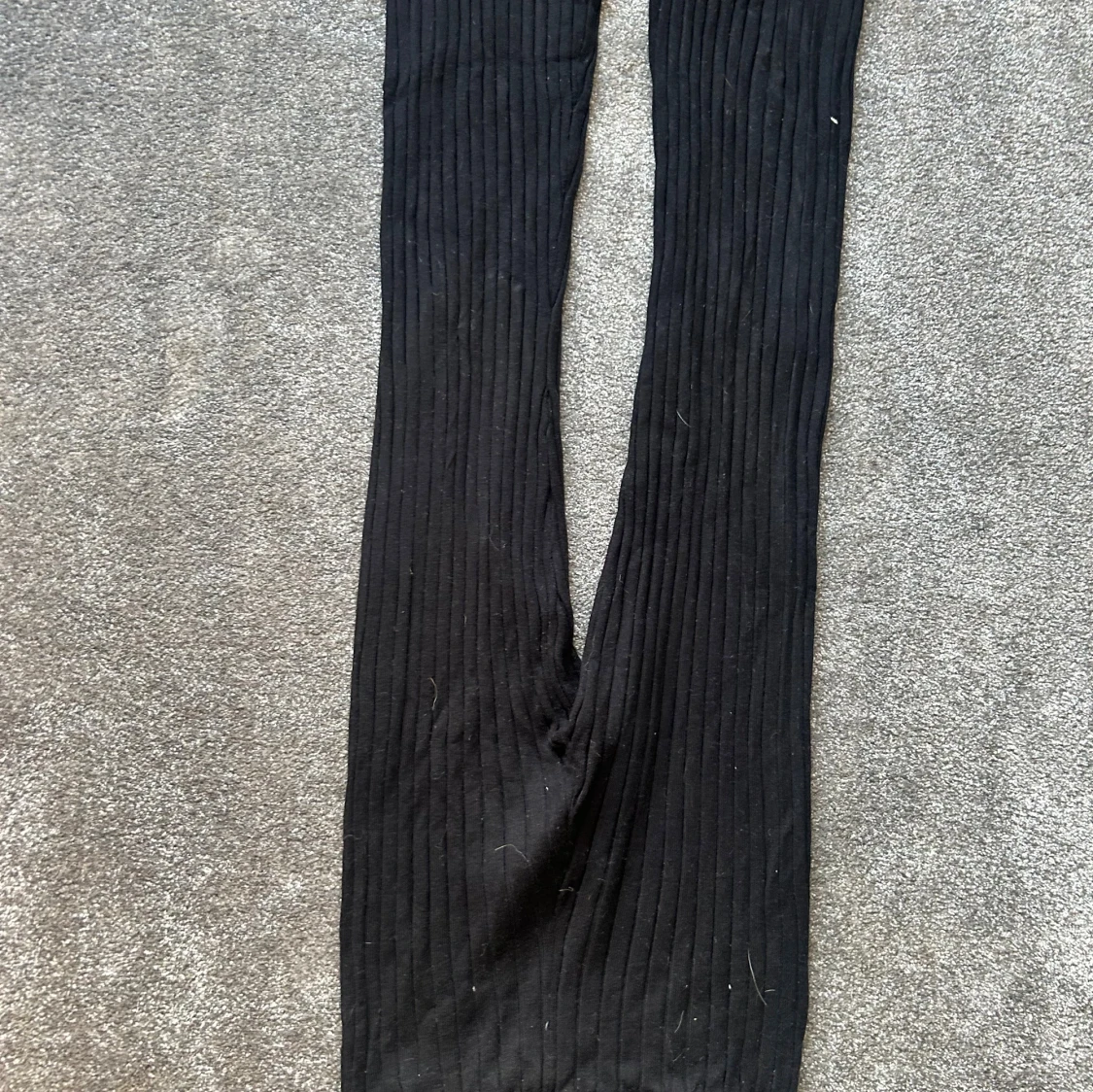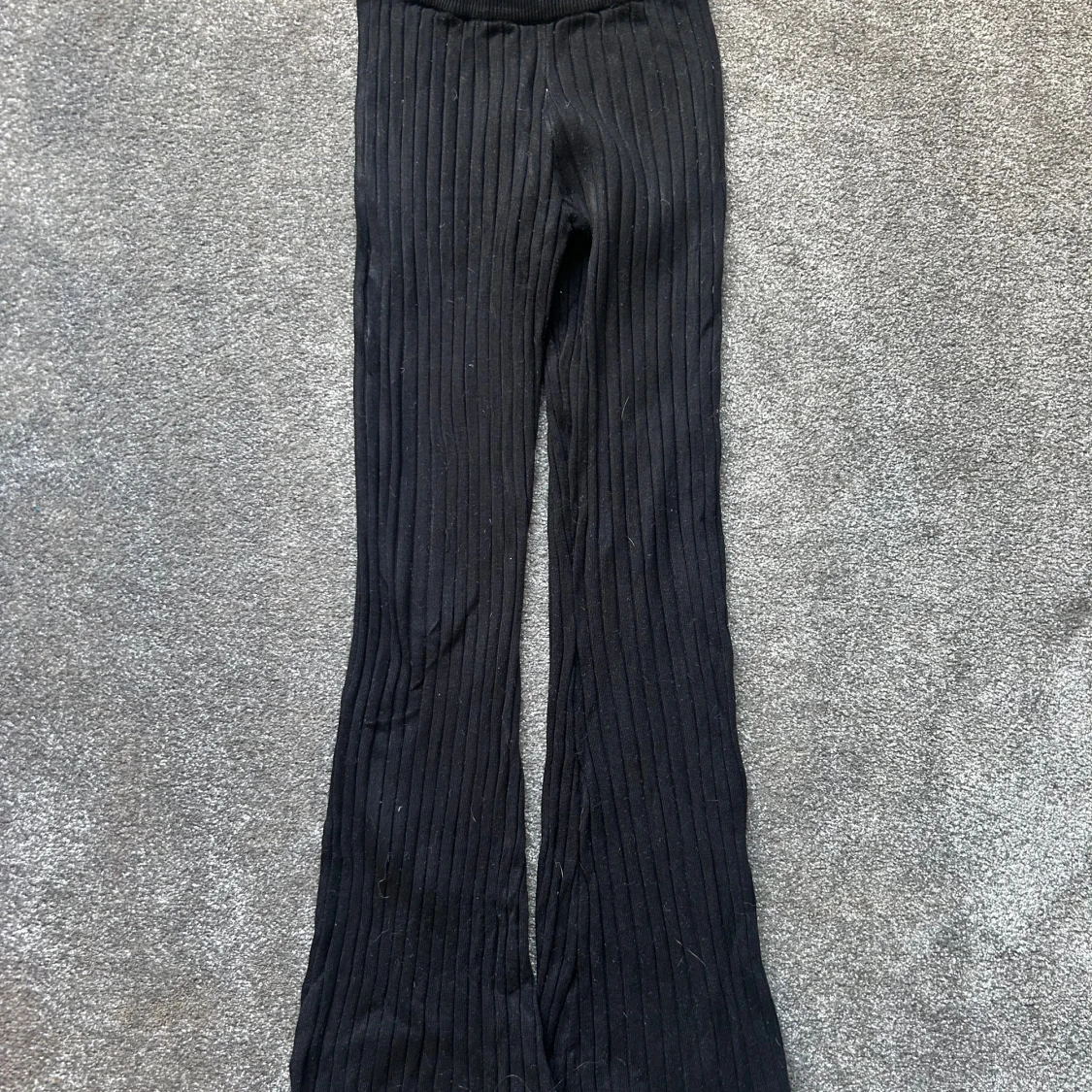 Svarta ribbade byxor från H&M med hög midja och utsvängda ben. Byxorna är stickade i ett mjukt material och har en bekväm passform. Perfekta för en chill och trendig look.