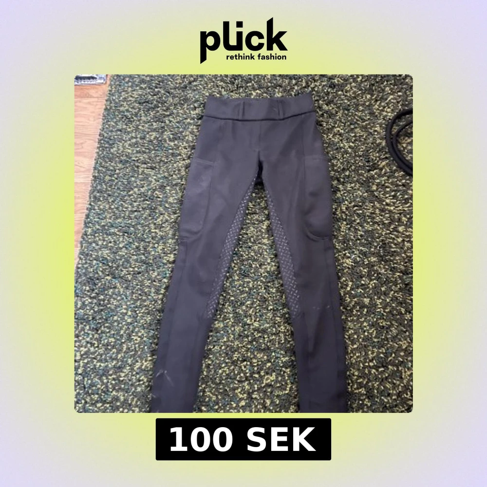 Svarta ridleggings med helskodd grepp i sätet och längs insidan av benen. Byxorna har praktiska fickor på sidorna och är tillverkade i stretchigt material av polyester och spandex. Perfekta för ridning och ger bra rörlighet.