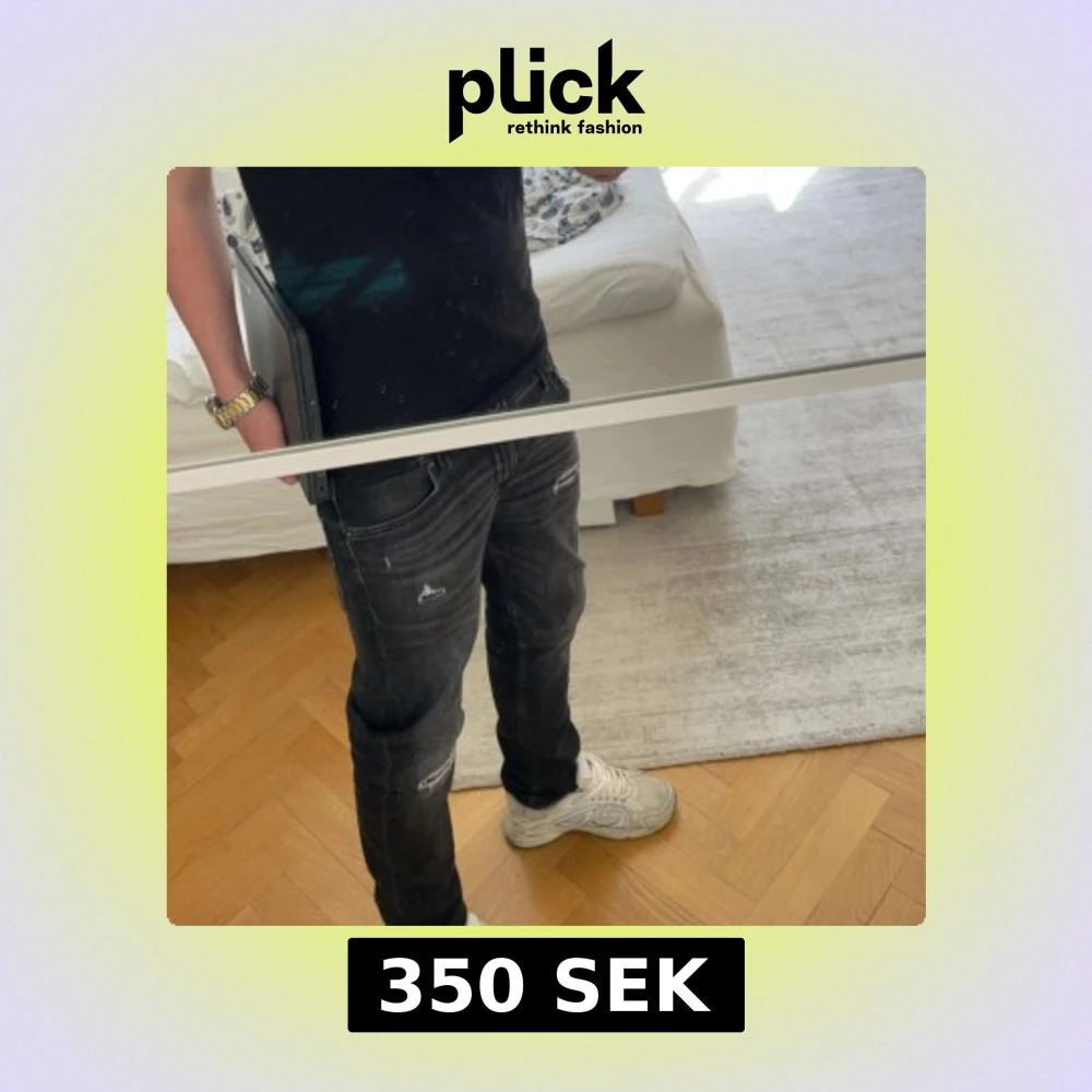 Säljer ett par svarta jeans från Jack & Jones med slitna detaljer och snygga rippade partier på låren och knäna. Väldigt bra skick, står 13y/158 men passar mig bra på bilderna som är 170 55kg. Kom med feågor/ fler bilder. Pris ej hugget i sten, mvh John