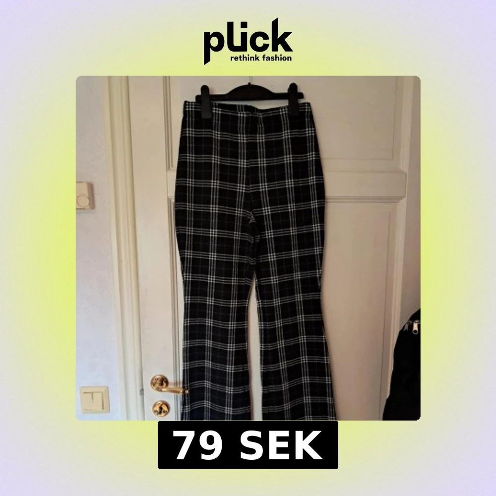 Snygga svarta bootcut-byxor från H&M i storlek S. Byxorna har ett vitt rutmönster och är tillverkade i ett mjukt material med lite stretch. Perfekta för dig som gillar en trendig och bekväm stil med lite extra edge.
