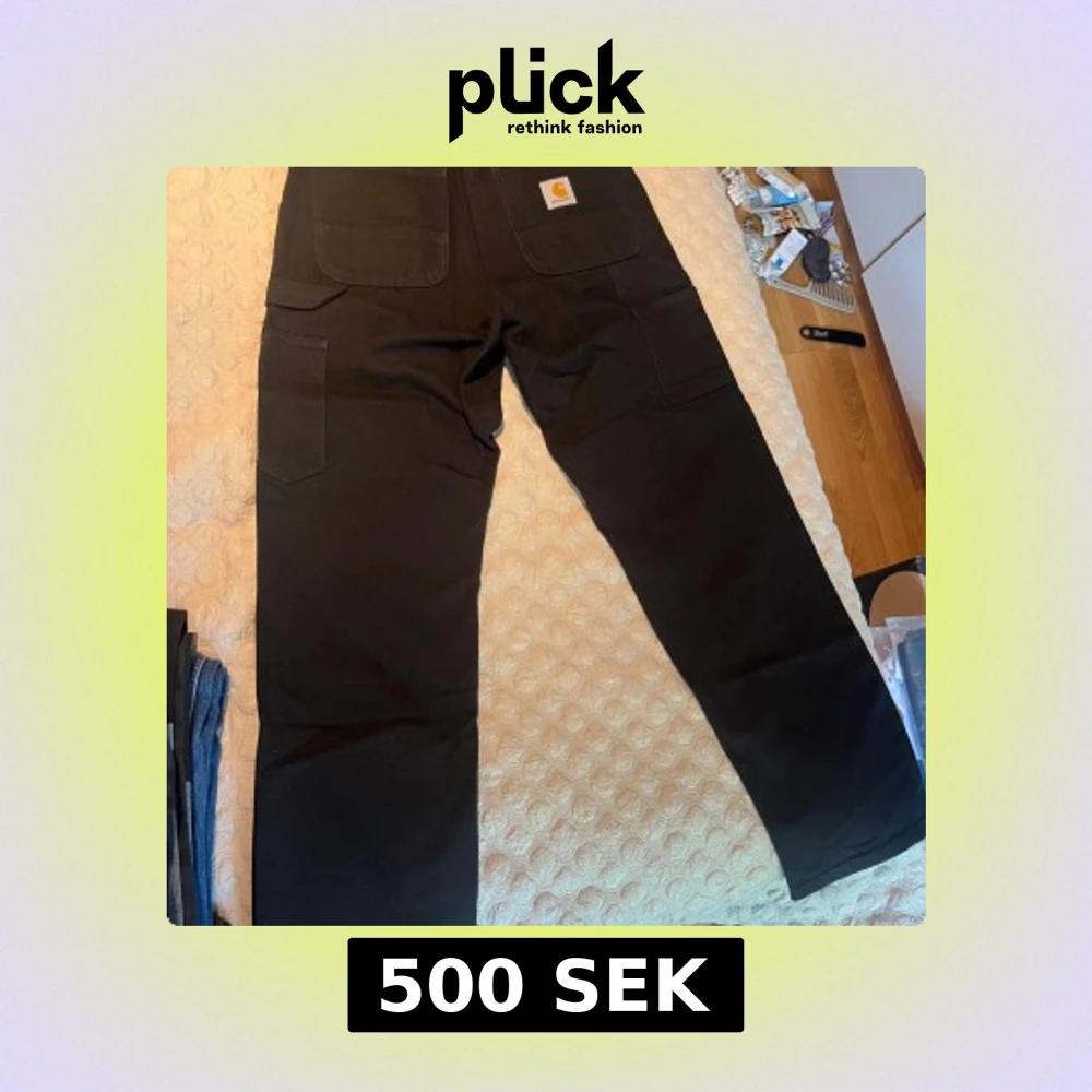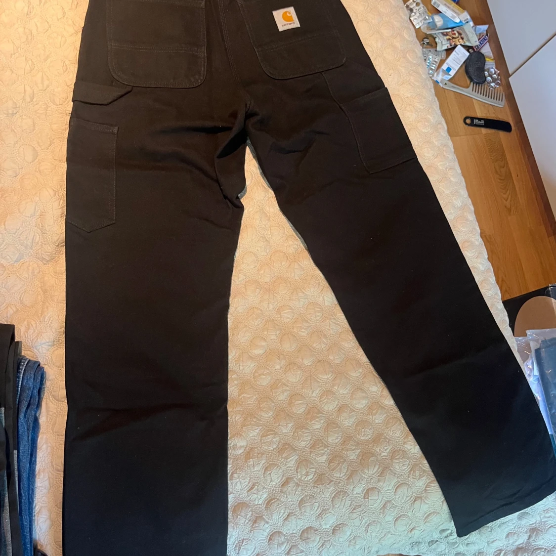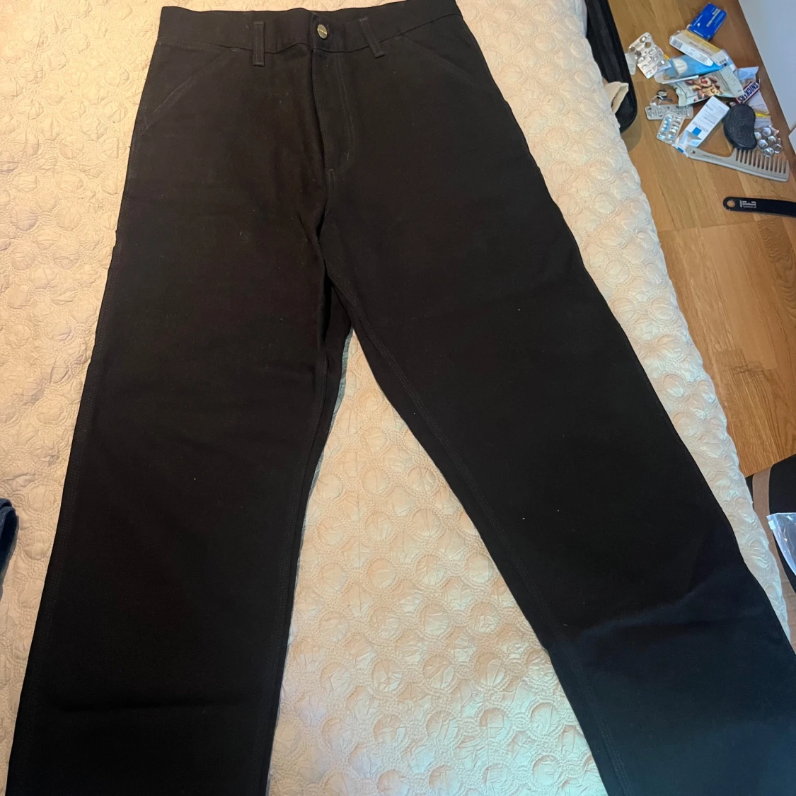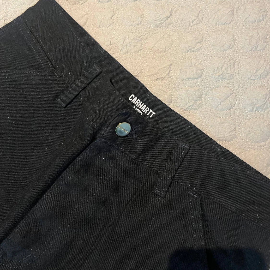 Svarta cargobyxor från Carhartt med raka ben och flera praktiska fickor, inklusive stora fickor på låren och bakfickor med Carhartt-logga. Byxorna är tillverkade i slitstark bomull och har en klassisk, loose passform.