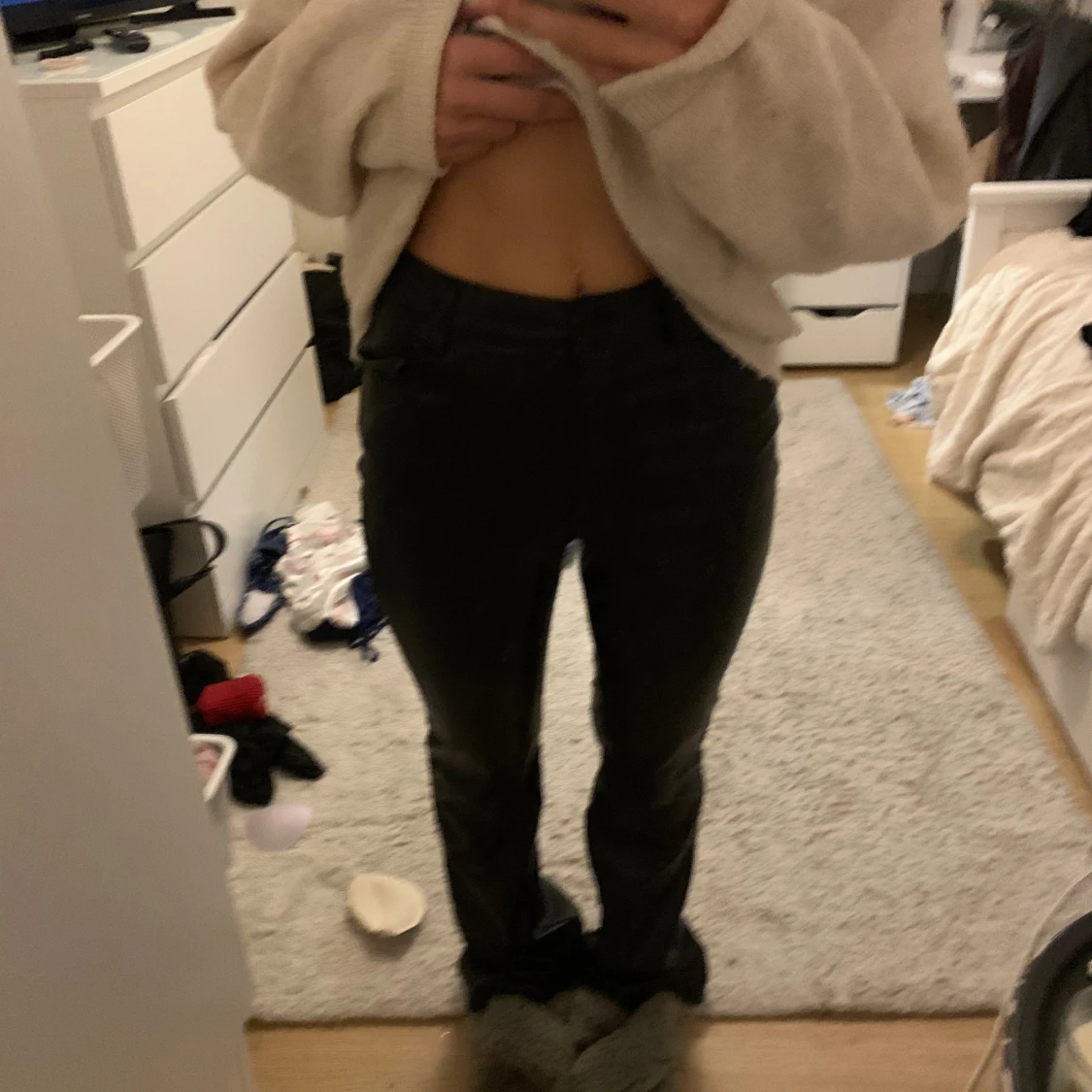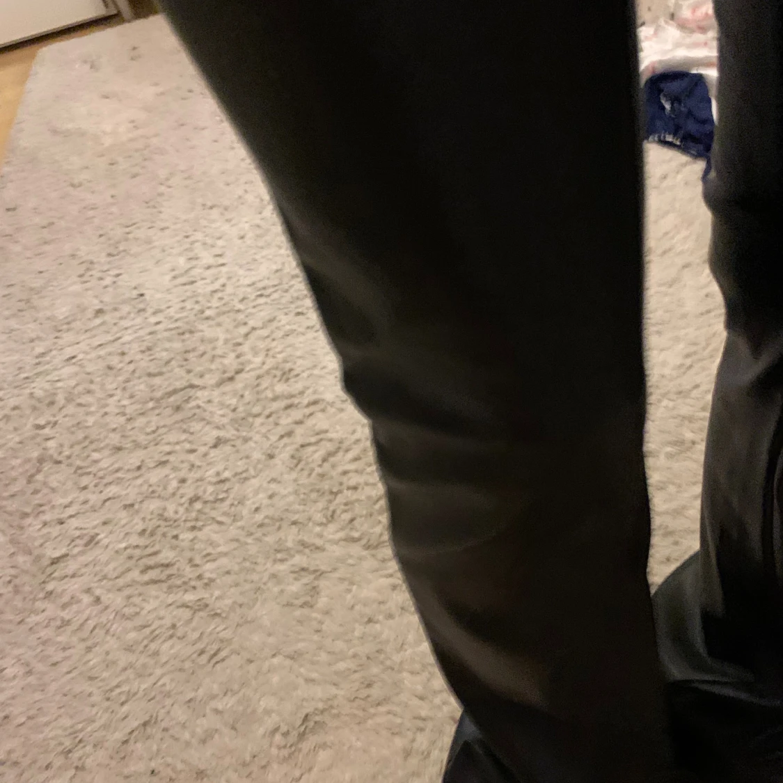 Snygga svarta byxor i skinnimitation med utsvängd passform och högre midja. Byxorna har klassisk femficksdesign och stängs med dragkedja och knapp. Perfekta för dig som vill ha en edgy och trendig look.