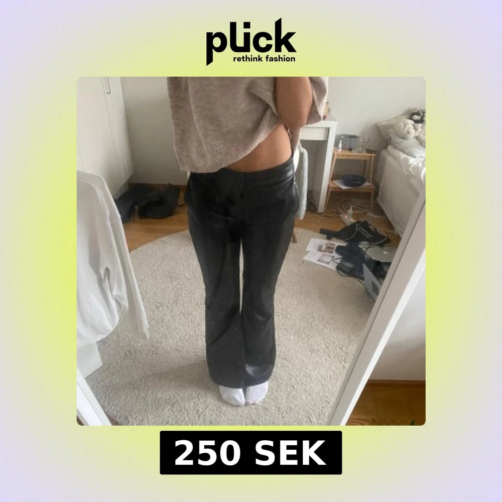 säljer dessa super snygga utsvängda skinnbyxor från Bershka i storlek S. säljer eftersom jag vill ha dom i xs, så ifall någon vill byta funkar de också💕