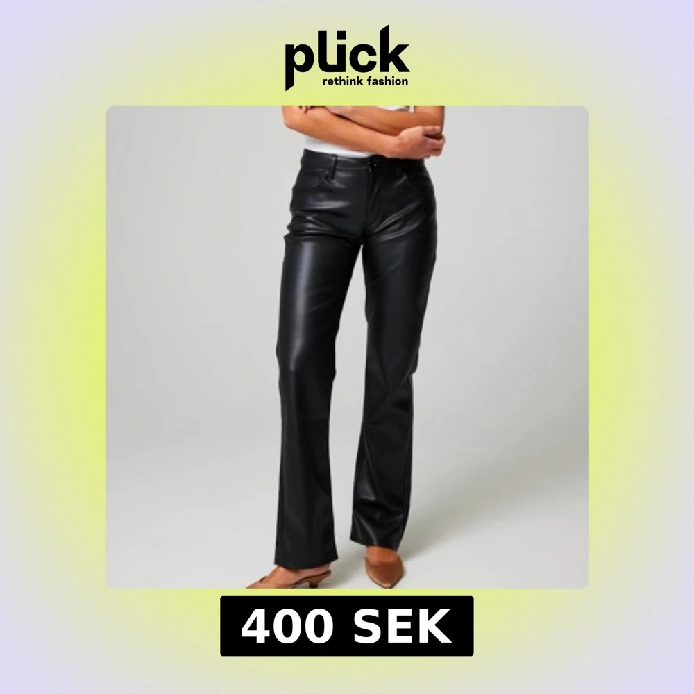 Snygga svarta skinnbyxor med bootcut. Byxorna har en låg midja. Sparsamt använda från bikbok! Nypris:599kr storlek 38 men passar mig som vanligtvis har storlek 36/S