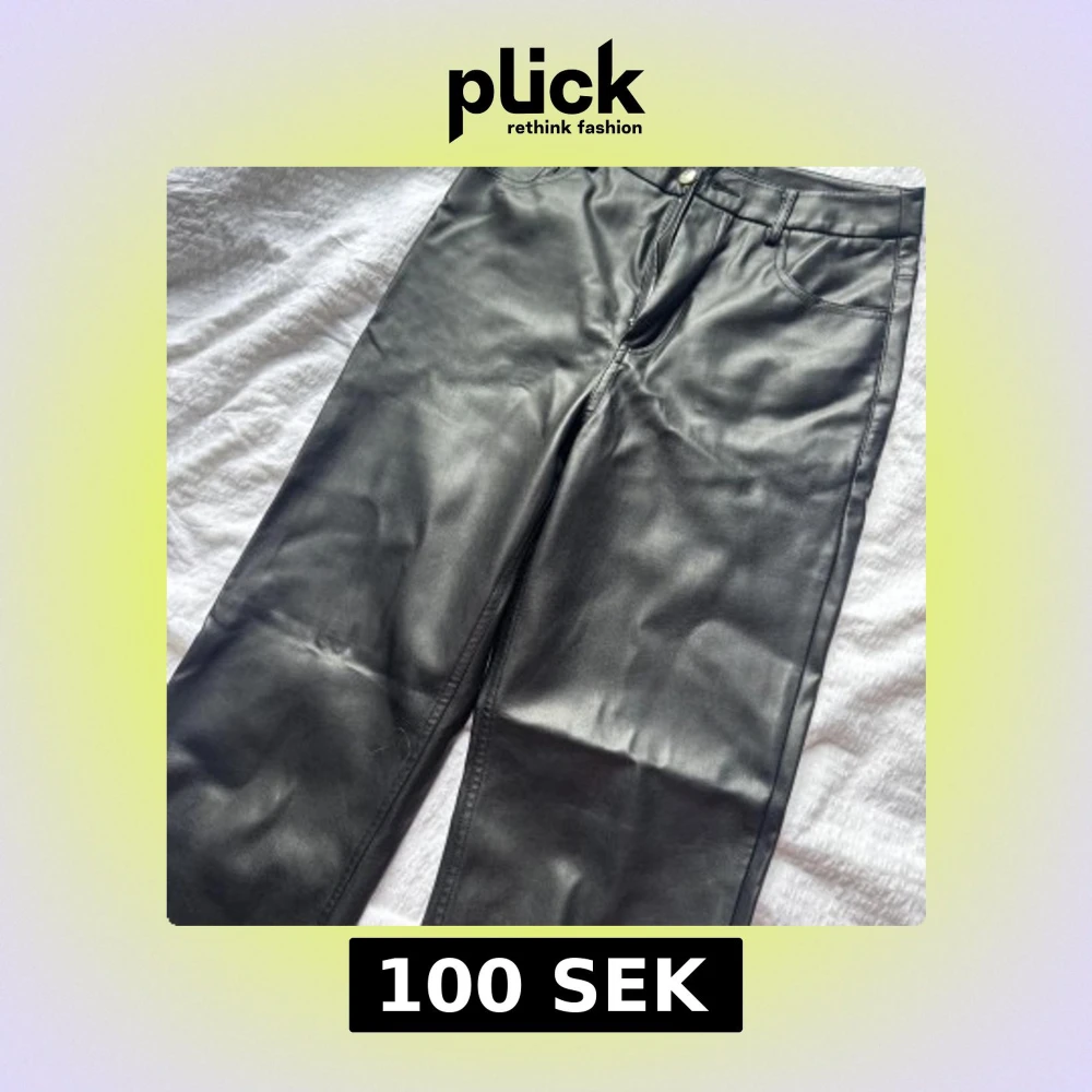 Säljer ett par svarta skinnbyxor från Gina Tricot i storlek 34. Byxorna är raka i benen. Det är lite för stora på mig därav säljer jag dom. Det är använda ett fåtal gånger men byxorna har lite märken som syns på bild 3 men det är inget som syns. Skriv privat för mer bilder
