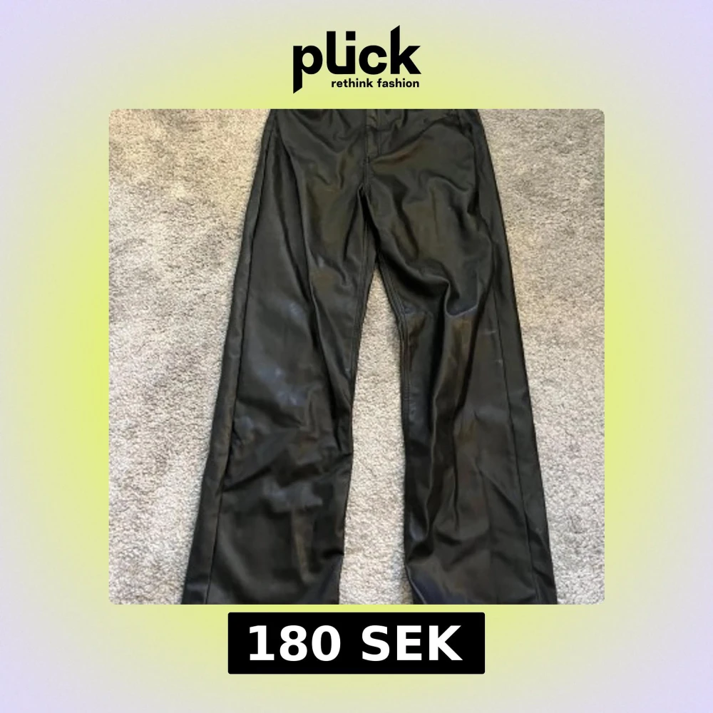 Säljer ett par svarta skinnbyxor från H&M med raka ben och klassisk passform. Byxorna har fickor bak och stängs med dragkedja och knapp framtill. Perfekta för en trendig look.