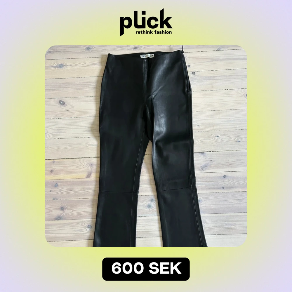 Snygga svarta skinnbyxor från Zara i storlek XS. De har en tight upp till/bootcut ner till passform och dragkedja på sidan för en stilren look.