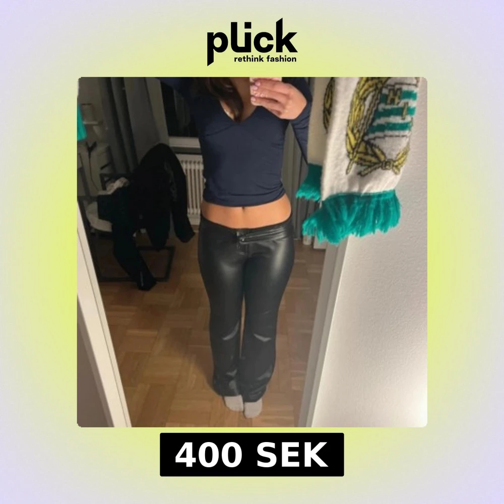 Snygga svarta skinnbyxor med medelhög midja som kan vikas ner till lågmidjat utan att det ser skumt ut, så som jag använt de.