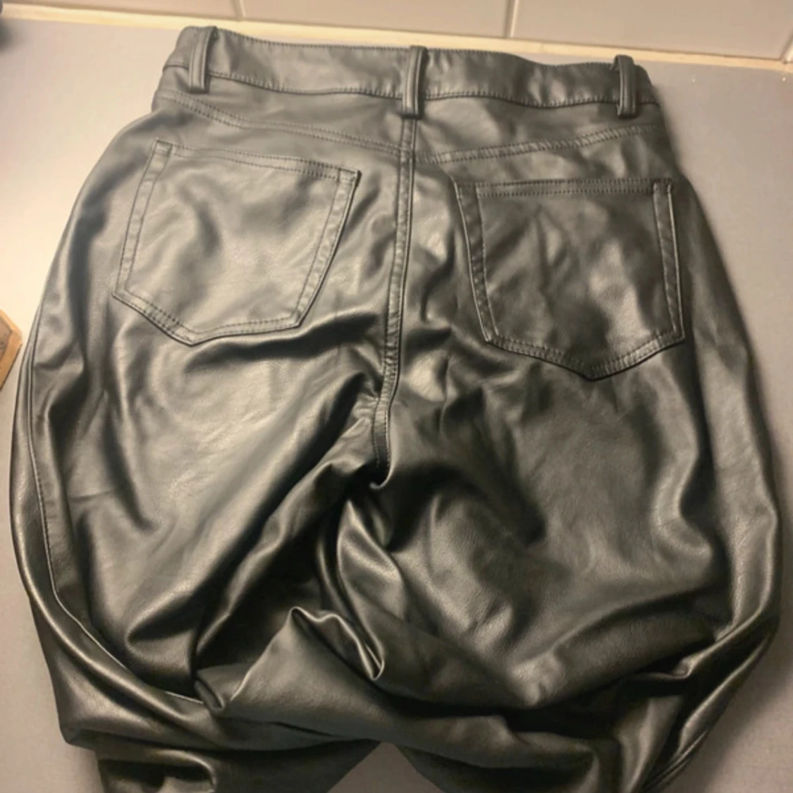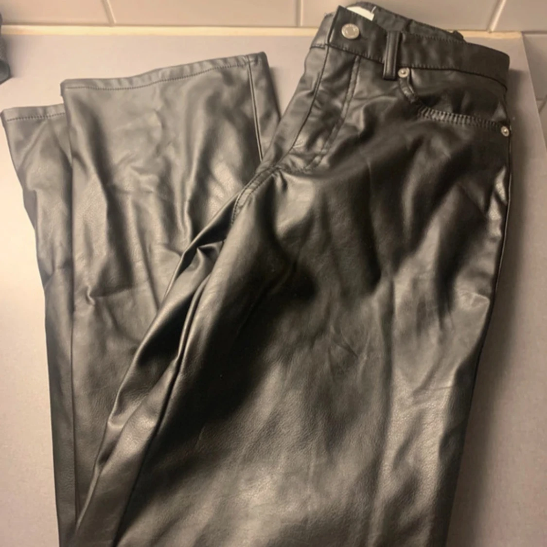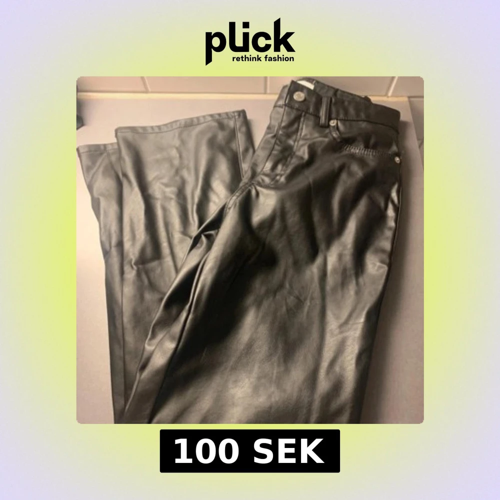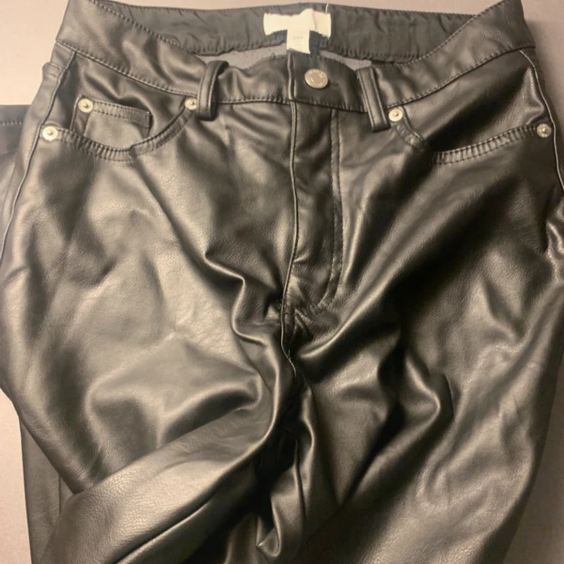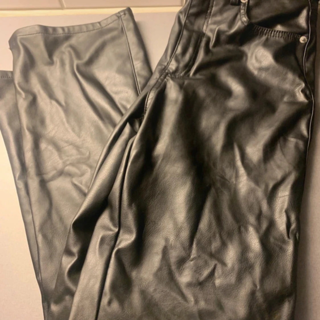 Snygga svarta byxor i skinnimitation med raka ben och klassisk femficksmodell. Byxorna har bälteshällor, knapp och dragkedja framtill samt bakfickor. Perfekta för en edgy look och passar till allt.