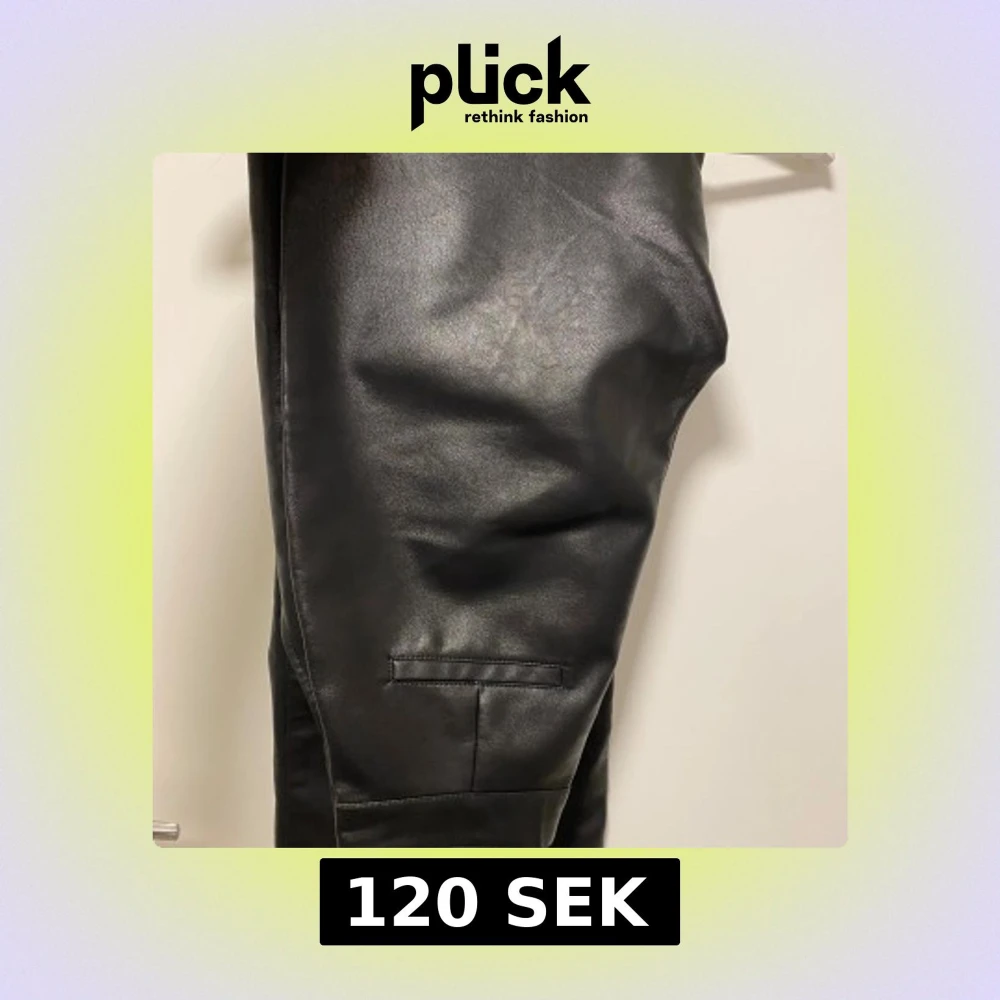 Snygga svarta byxor i skinnimitation med raka ben och hög midja. Byxorna har fickor fram och bak samt markerade sömmar längs benen.