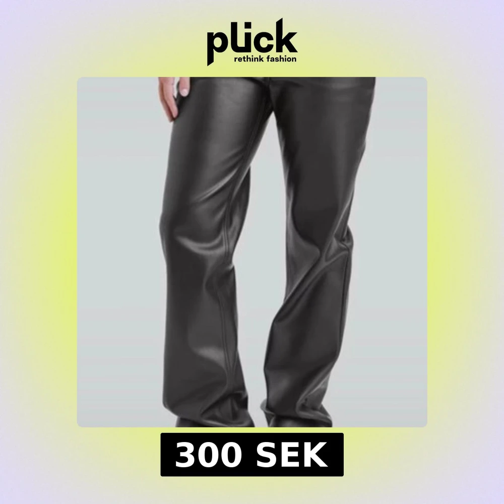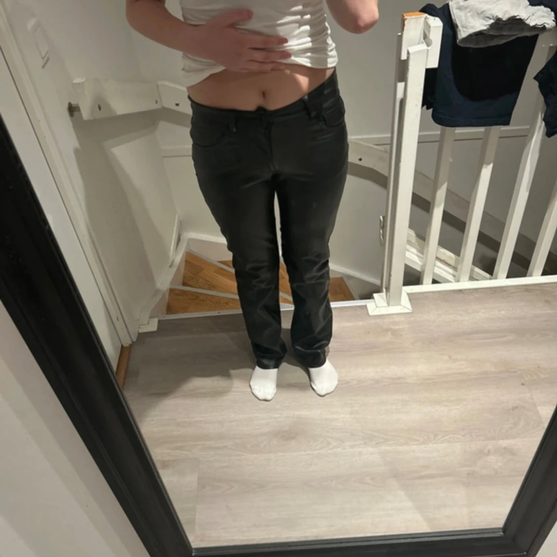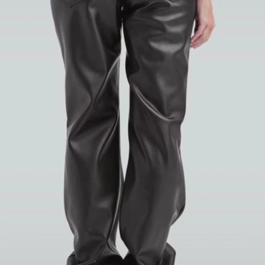Snygga svarta byxor i skinnimitation med klassisk rak passform. Byxorna har låg midja och femficksdesign, vilket ger en cool och tidlös look. Perfekta för dig som vill sticka ut med en edgy vibe. Passar till både sneakers och boots.