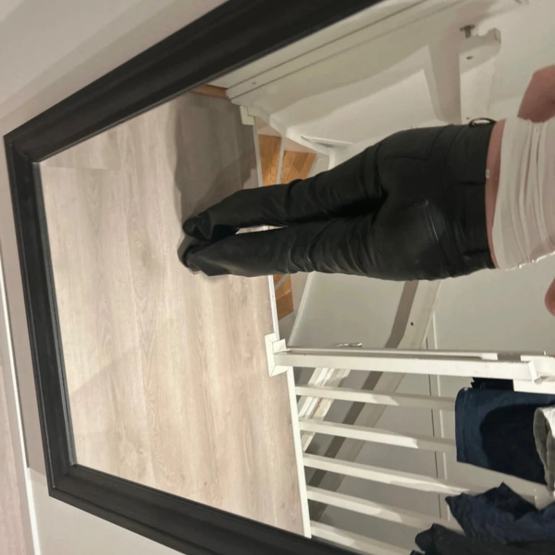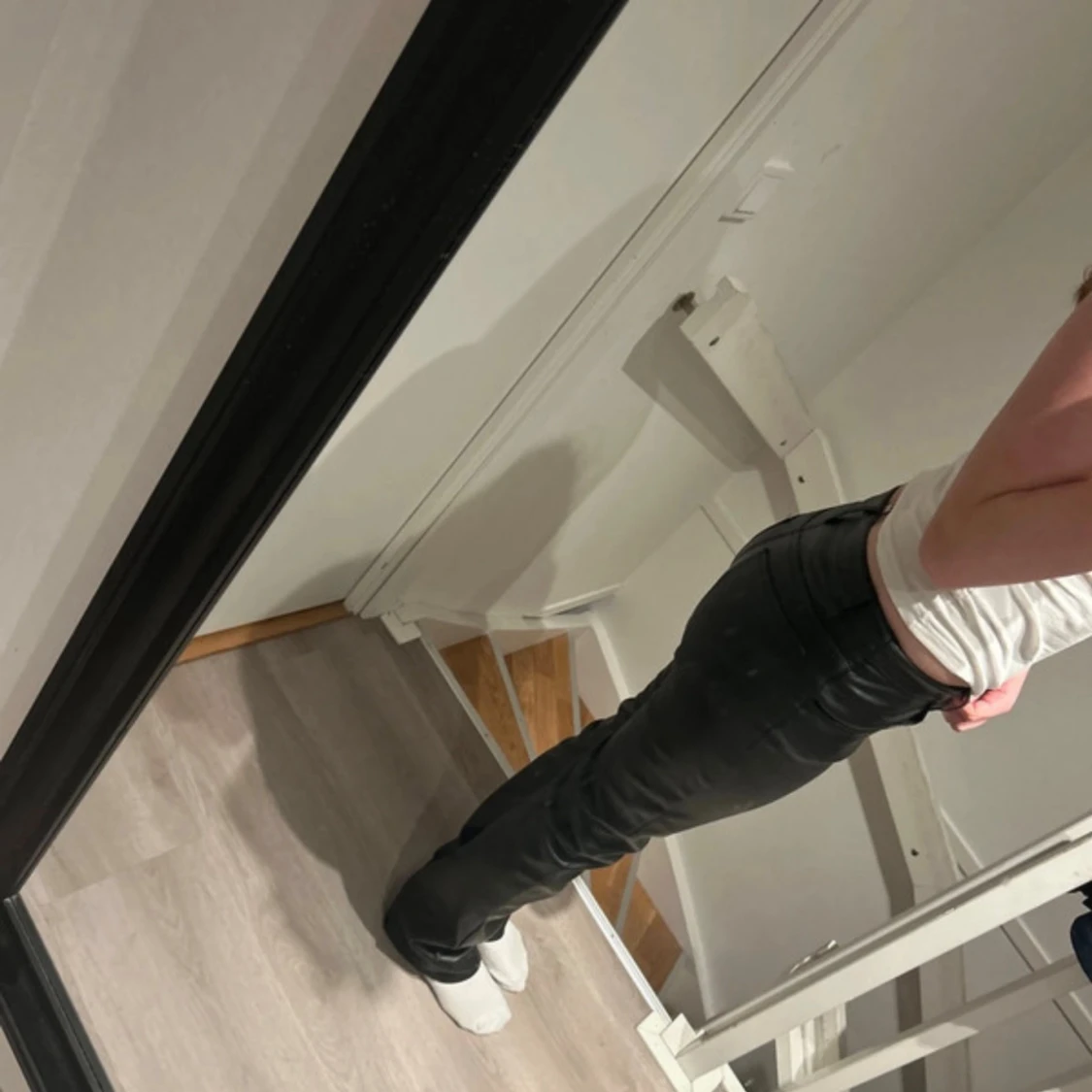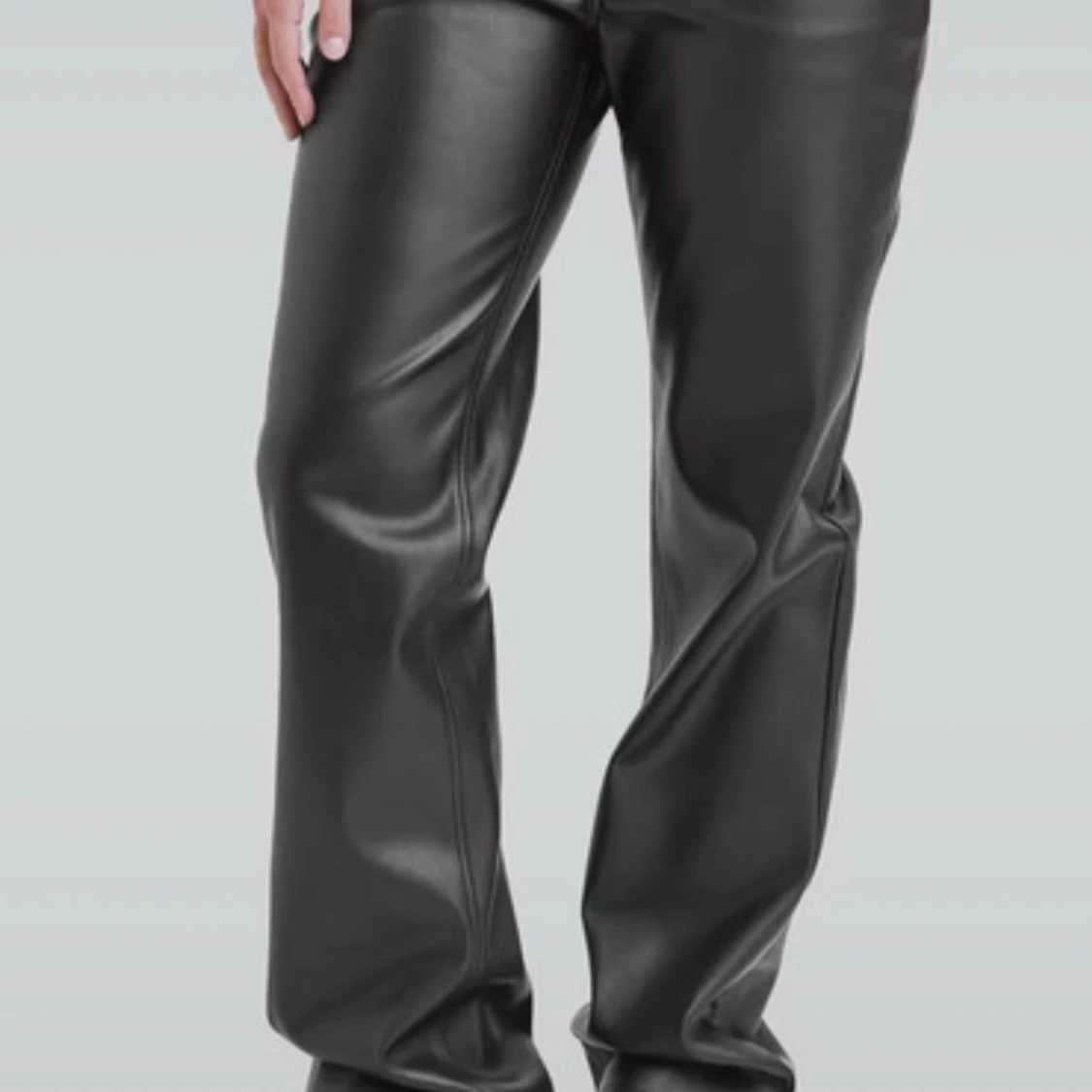 Snygga svarta byxor i skinnimitation med klassisk rak passform. Byxorna har låg midja och femficksdesign, vilket ger en cool och tidlös look. Perfekta för dig som vill sticka ut med en edgy vibe. Passar till både sneakers och boots.