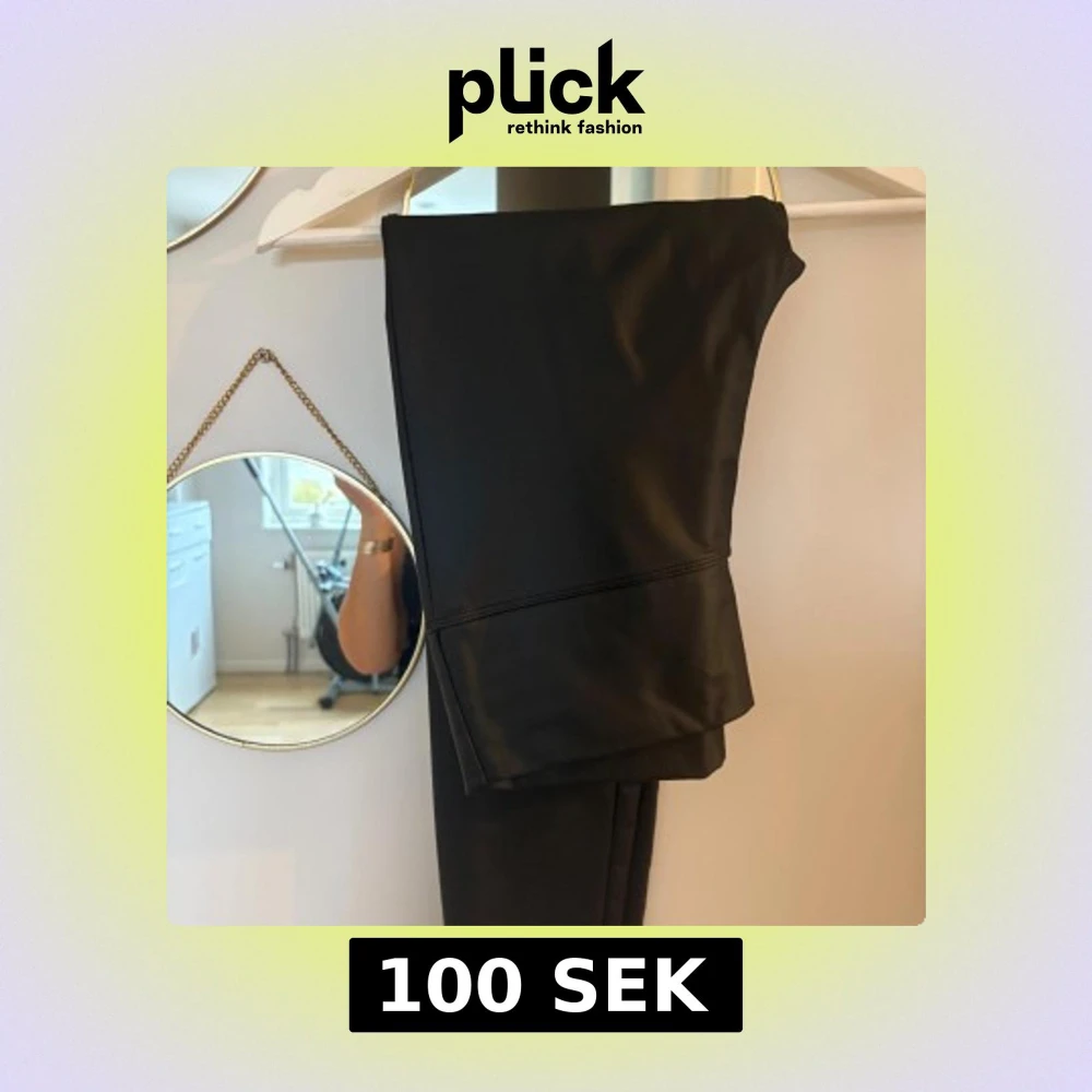 Säljer ett par svarta byxor i skinnimitation med stilren look. Byxorna har raka ben och en snygg söm vid knäna som ger extra edge. Perfekta för dig som vill ha en trendig och clean stil.