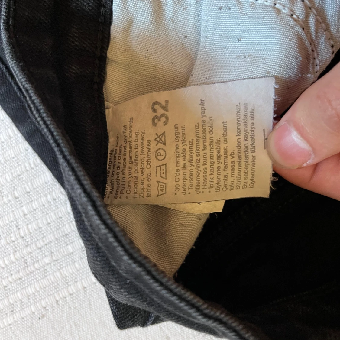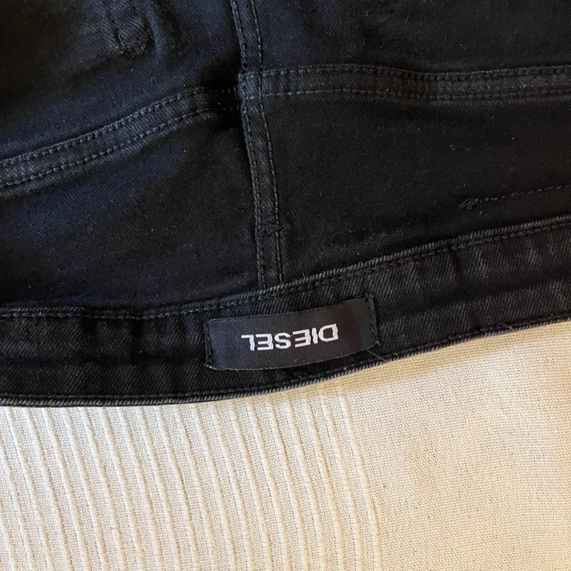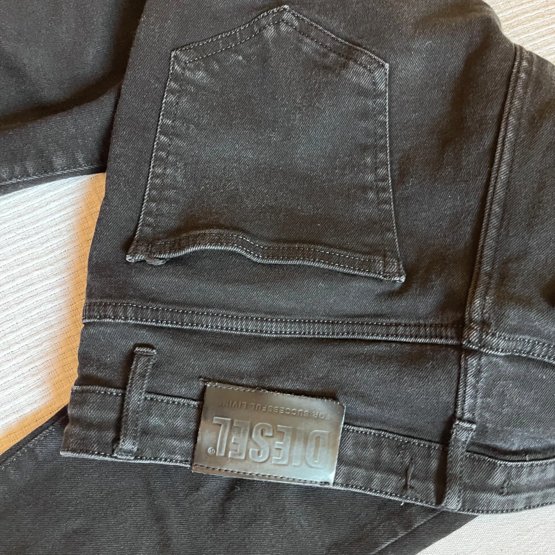 Svarta jeans från Diesel i storlek 32 med skinny passform. Snygga slitningar vid knäna ger en cool och edgy vibe. Klassisk femficksmodell med Diesel-logga på bakfickan. Jeansen är gjorda i stretchigt bomullsmaterial för skön komfort.