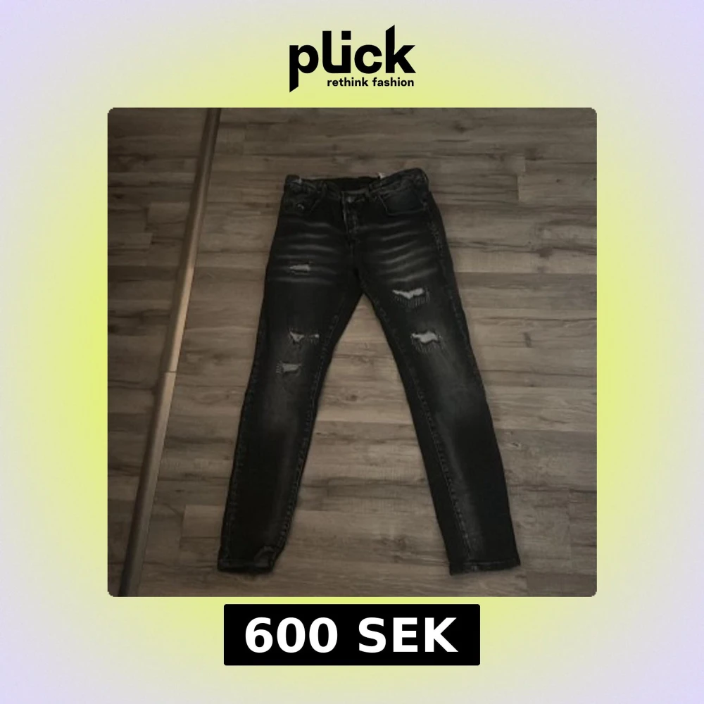 Säljer ett par svarta slim jeans från Dsquared2 med slitningar och coola detaljer framtill. Jeansen har klassisk femficksdesign, knappgylf och Dsquared2-logga vid linningen. Materialet är stretchigt jeans och passformen är slim