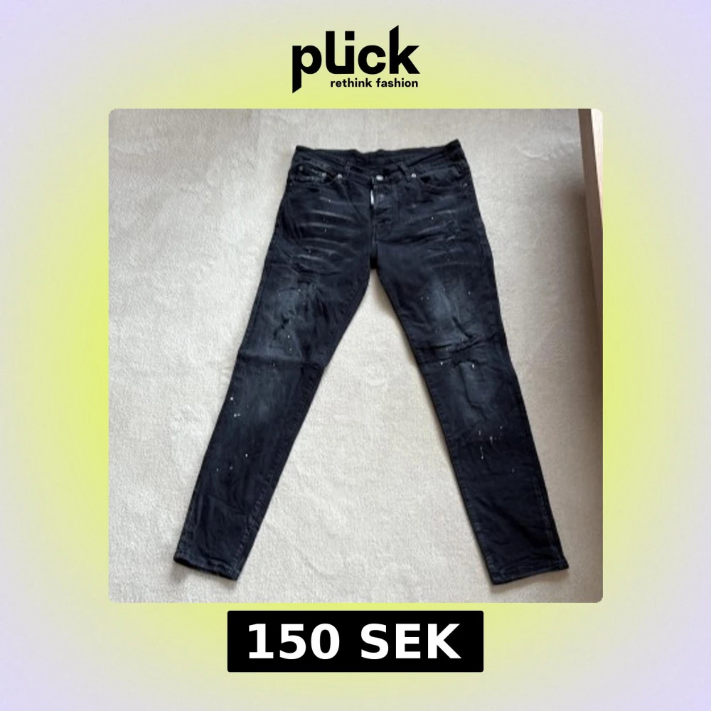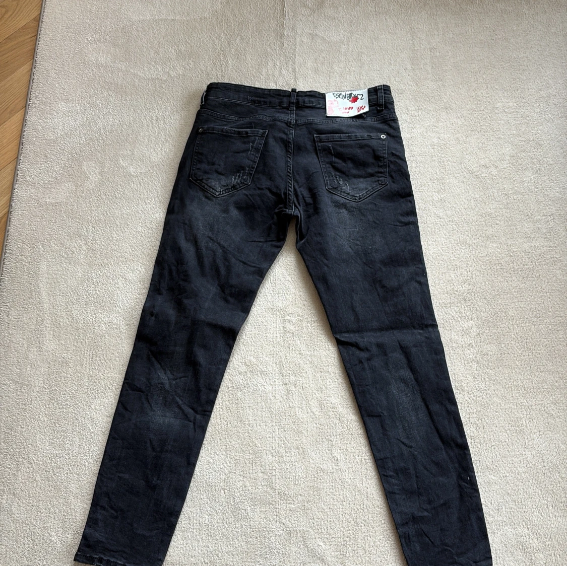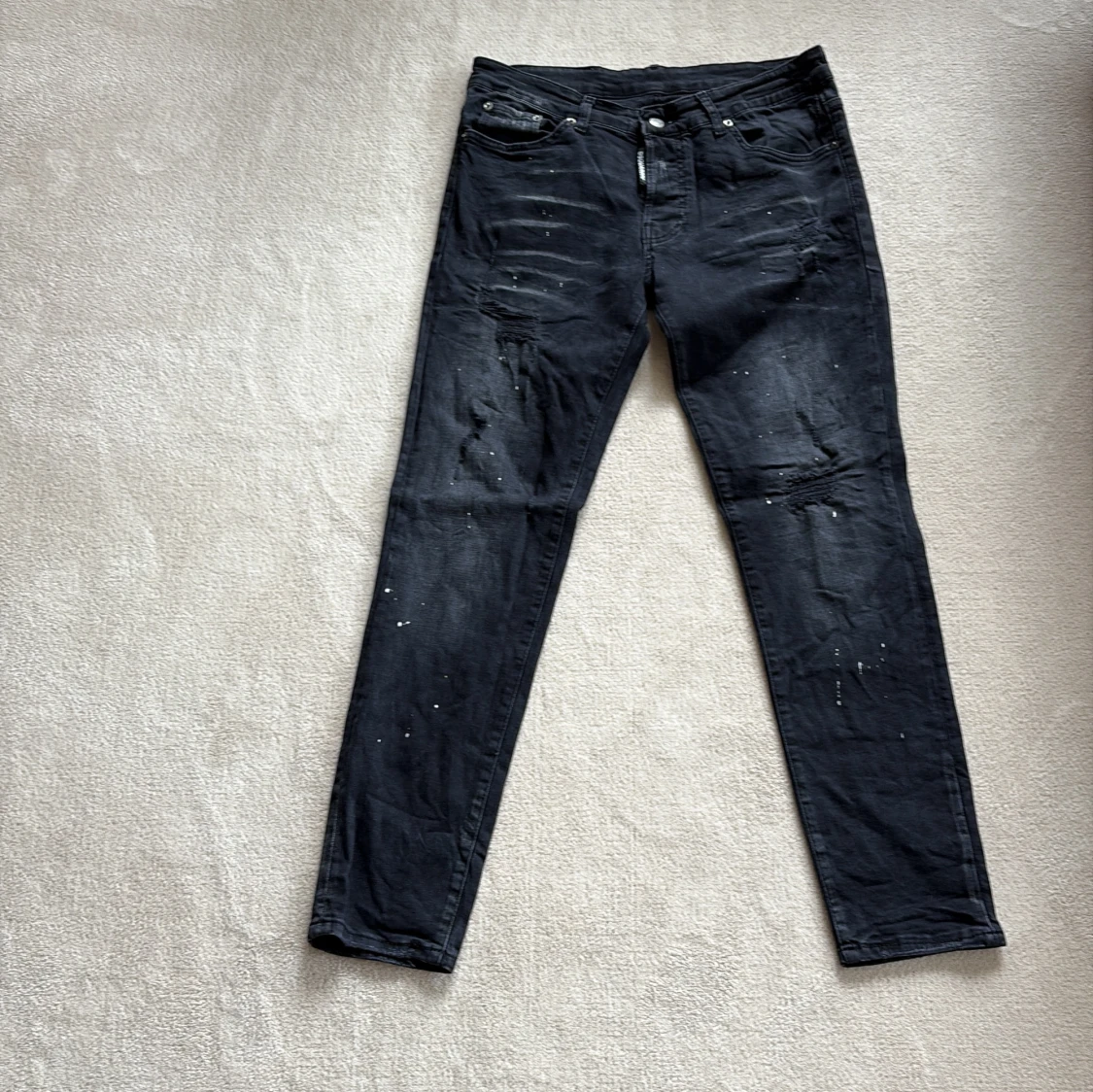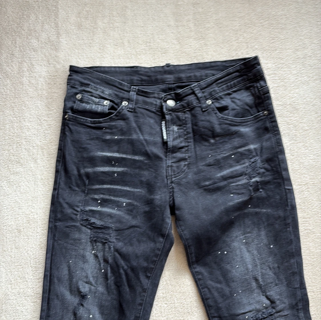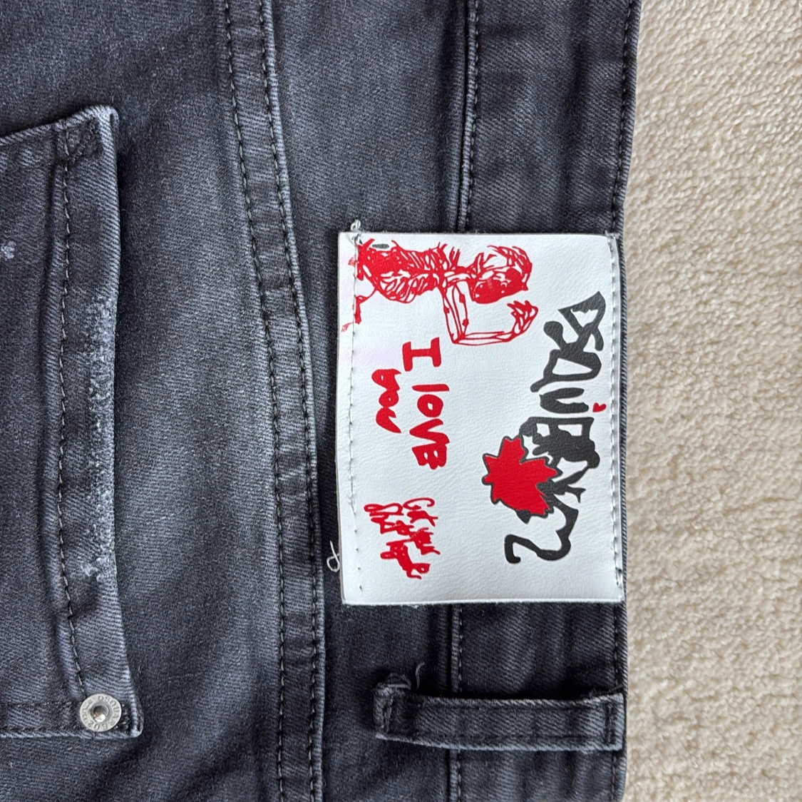 Svarta jeans från Dsquared2. med skinny passform och unika vita färgstänk. Klassisk femficksmodell med dragkedja och knapp. Bak finns en vit patch med röd och svart grafik samt texten 'I LOVE YOU'. Perfekta för en edgy streetstil.