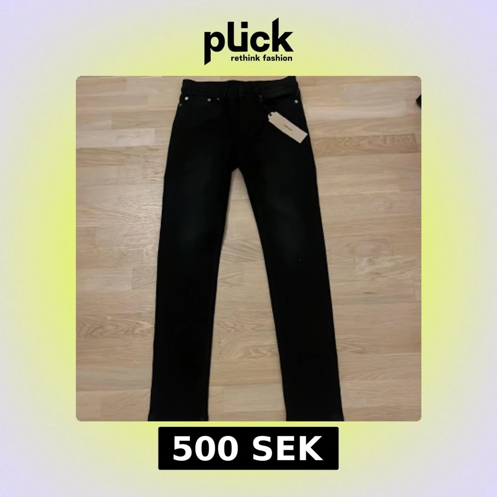Svarta jeans från Whyred med klassisk femficksdesign och smal passform. Byxorna har silverfärgade nitar och svart läderpatch med logga bak i midjan. Snygg, stilren look som passar till allt. Materialet är jeans med stretch för extra komfort.