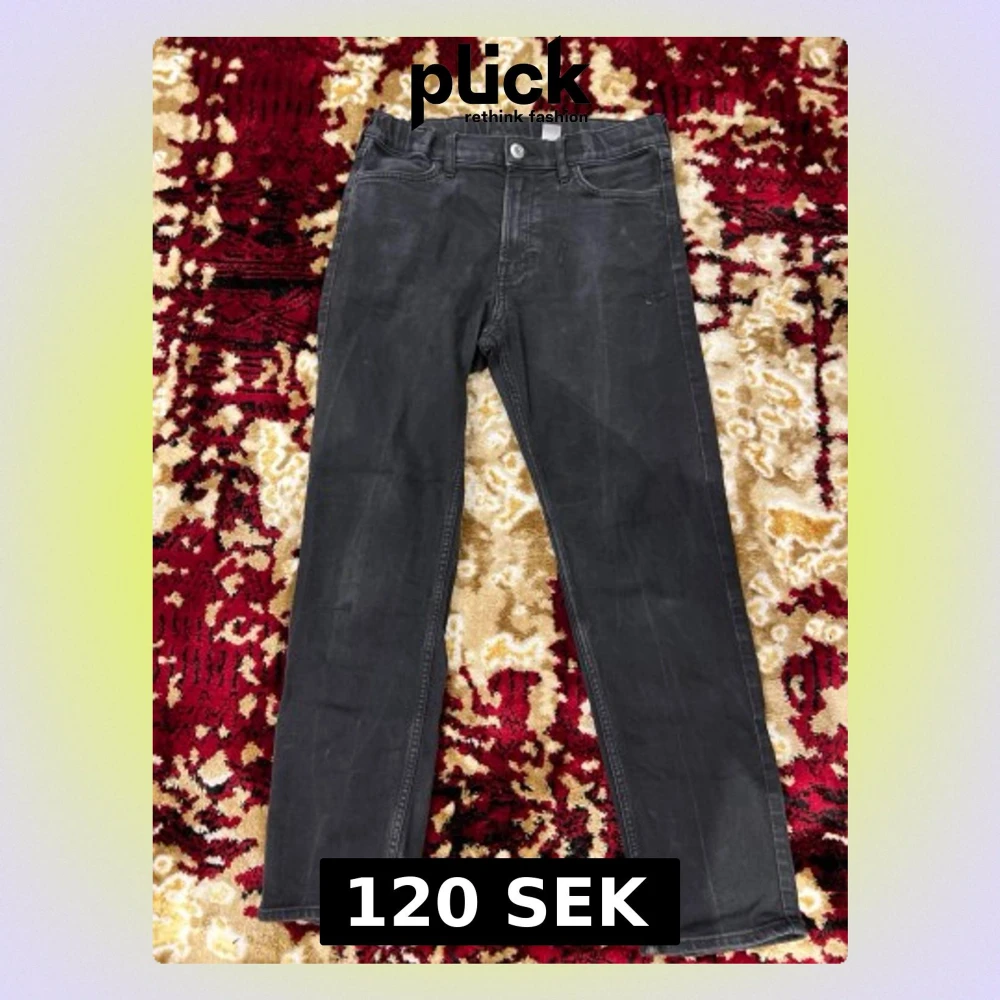 Svarta jeans från H&M i slim fit-modell med justerbar midja. Klassisk femficksdesign och knappstängning framtill. Snyggt smal passform som sitter tajt längs benen och passar perfekt till en modern stil.