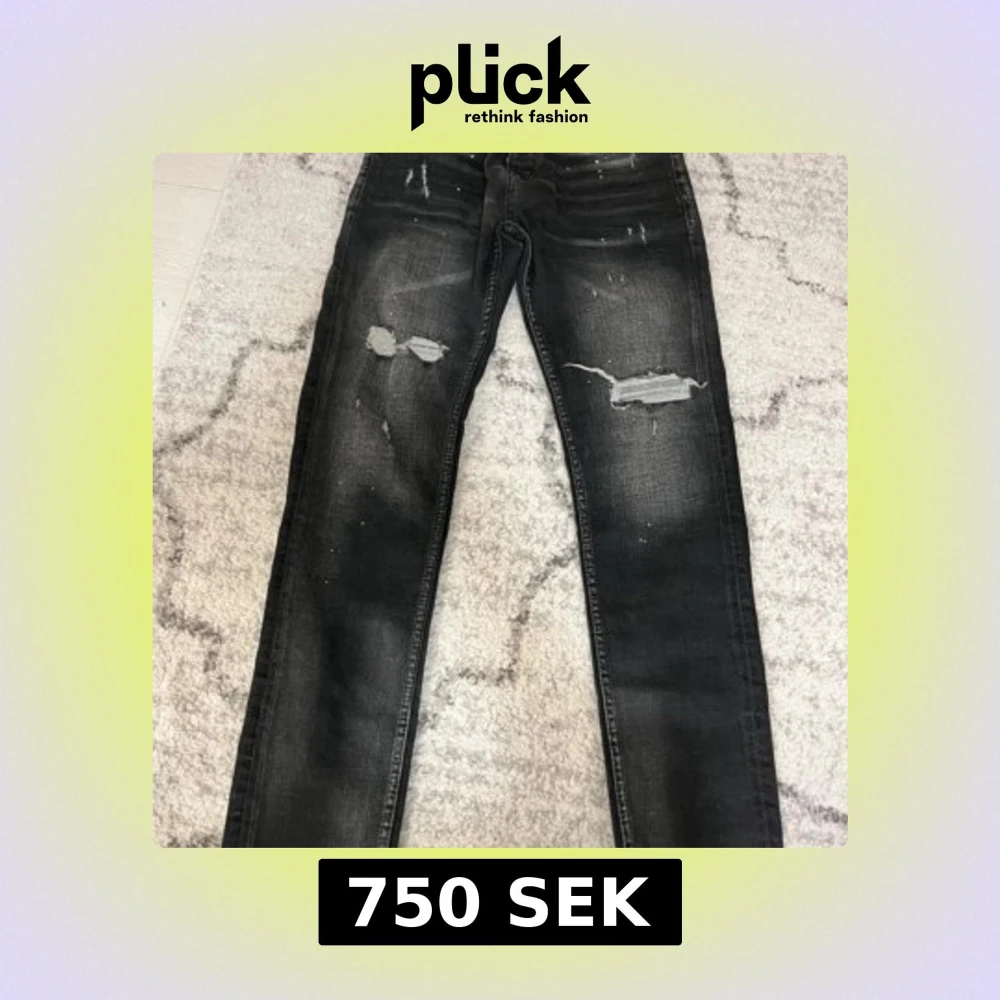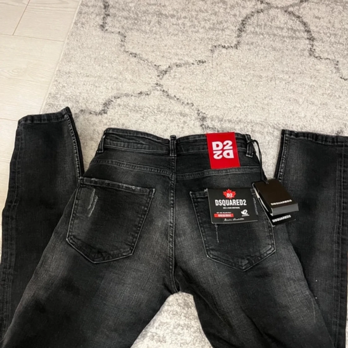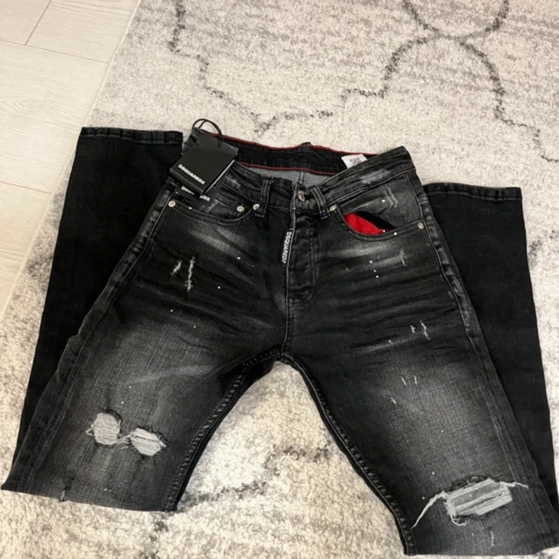 Säljer ett par svarta jeans från Dsquared2 med slitningar och hål på benen. Jeansen har fem fickor, dragkedja och knapp, samt röda detaljer på insidan. Snygg tvätt och trendig look.
