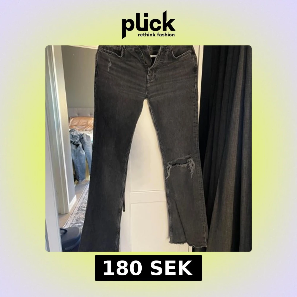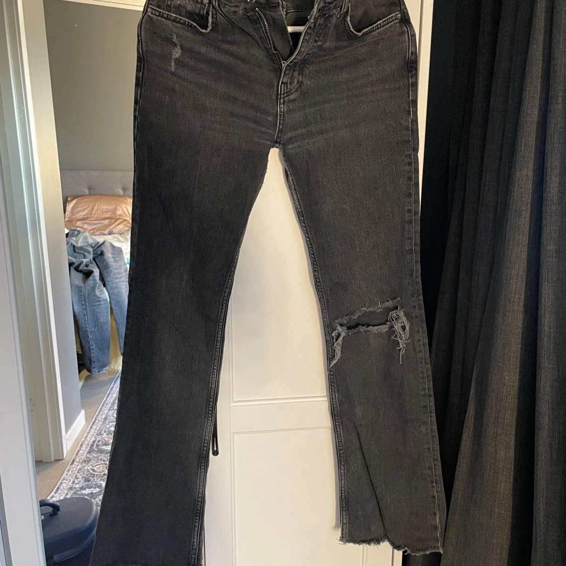Svarta jeans med råa kanter och stort hål på ena knät. Jeansen har en utsvängd passform och är tillverkade i denim. Perfekta för dig som gillar en edgy och avslappnad stil.