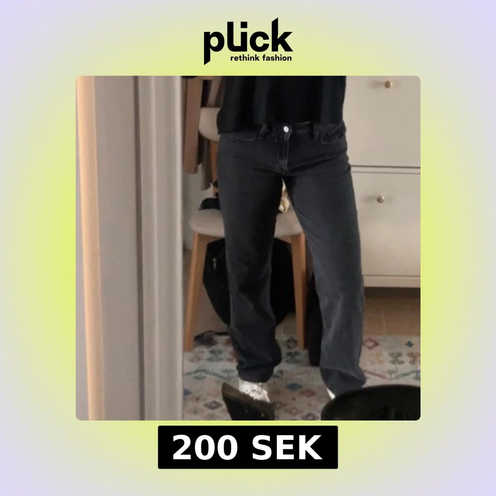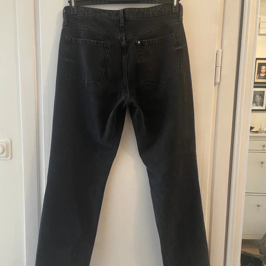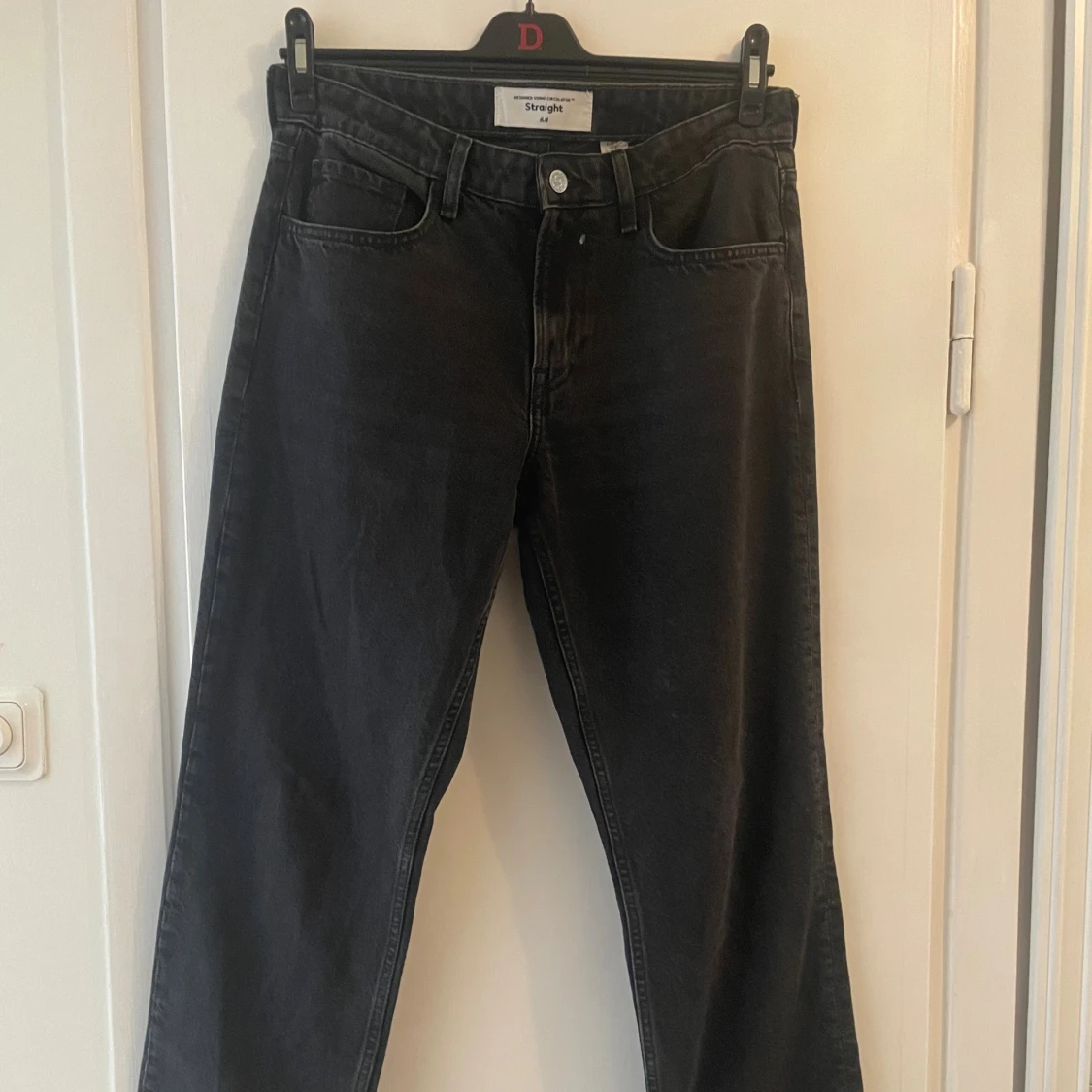 Svarta jeans med rak passform från HM. Jag är 172 cm lång och dom går över skorna på mig! Jag har storlek 38 så skulle säga att dom funkar som 38 och 40. Jeansen har en enkel och stilren look, perfekta till sneakers eller boots.