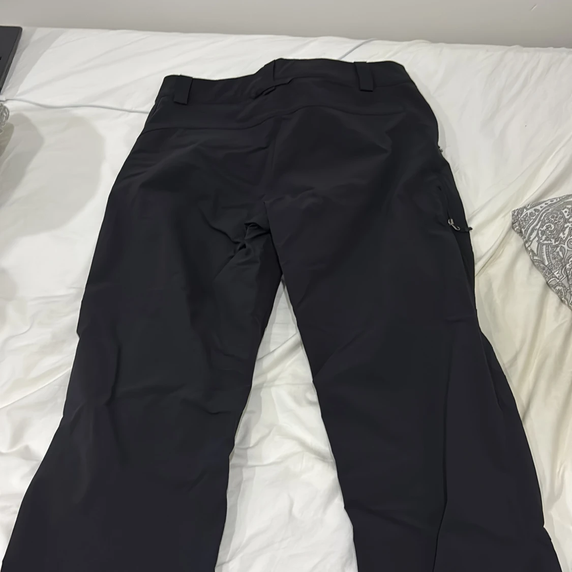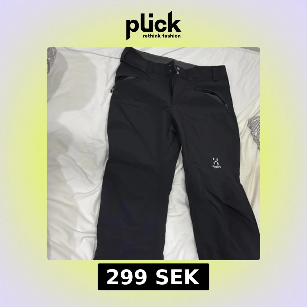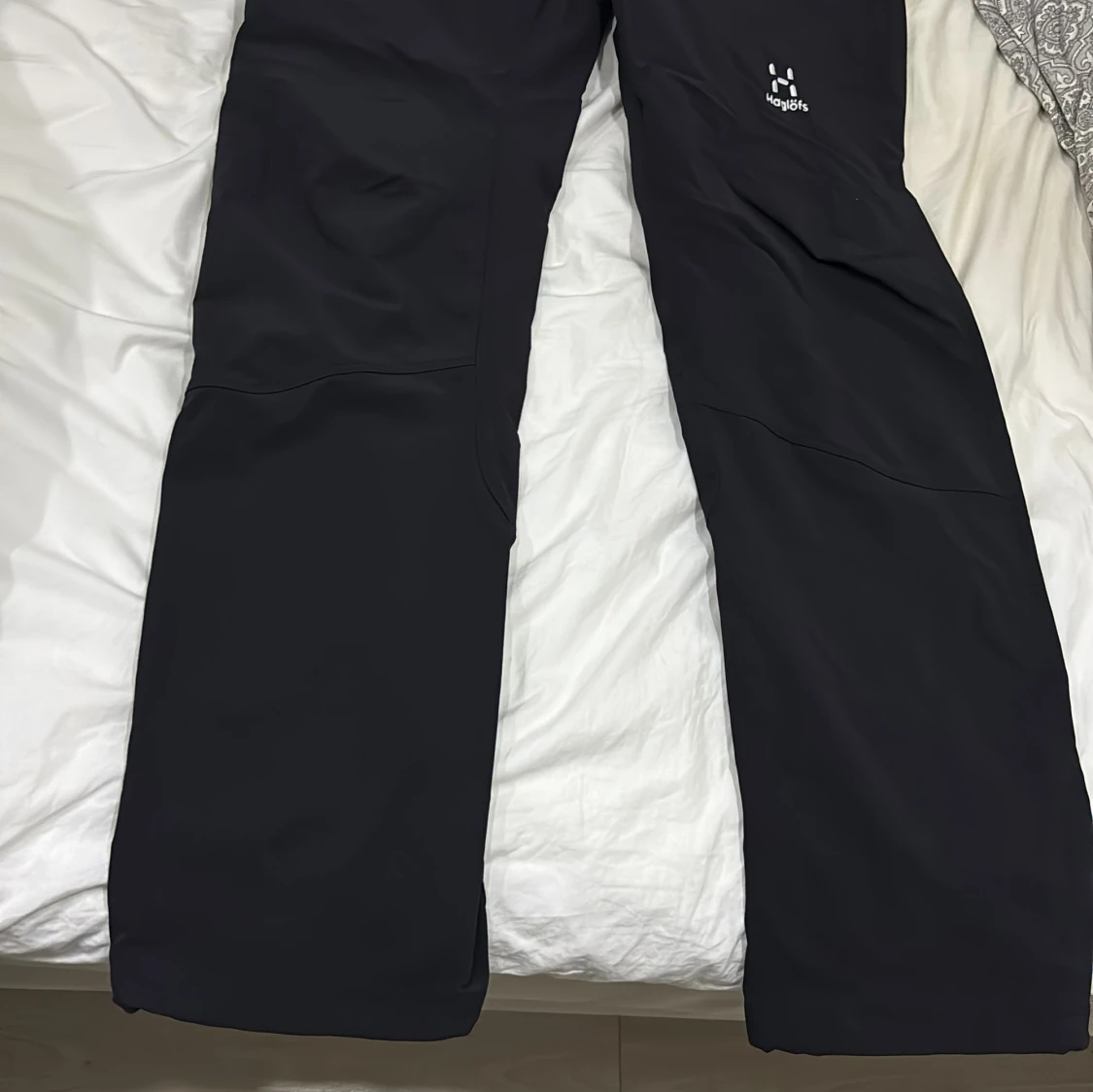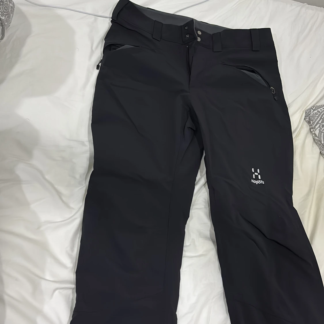 Säljer ett par svarta täckbyxor från Haglöfs. Byxorna har dragkedjor vid fickorna och en bekväm passform, perfekt för kalla dagar. De är designade för att hålla dig varm och torr under vinterns äventyr.