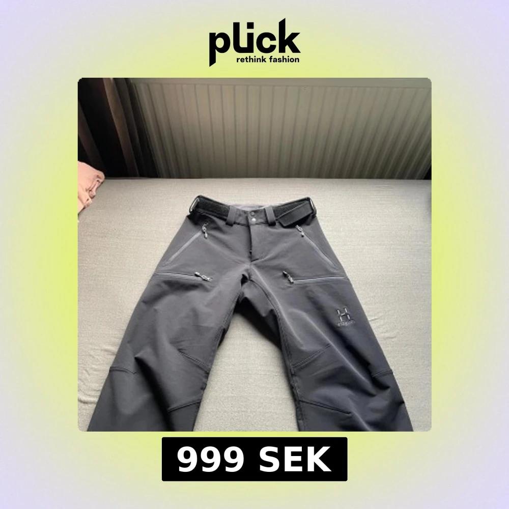 Säljer ett par svarta täckbyxor från Haglöfs med flera dragkedjeförsedda fickor och justerbar midja med kardborre. Byxorna har tryckknappar vid benslut och är gjorda i ett slitstarkt syntetmaterial, perfekta för utomhusaktiviteter och vinteräventyr.