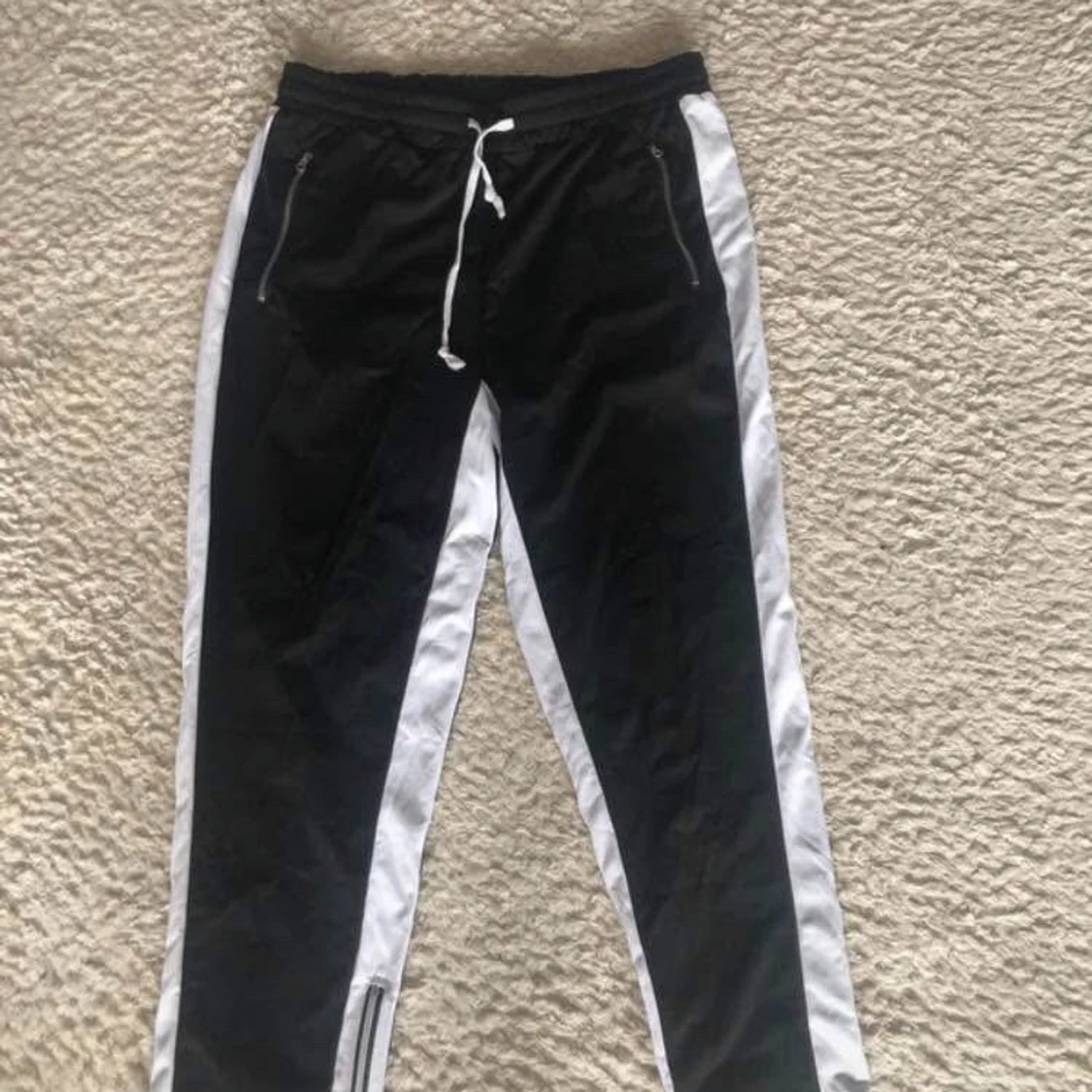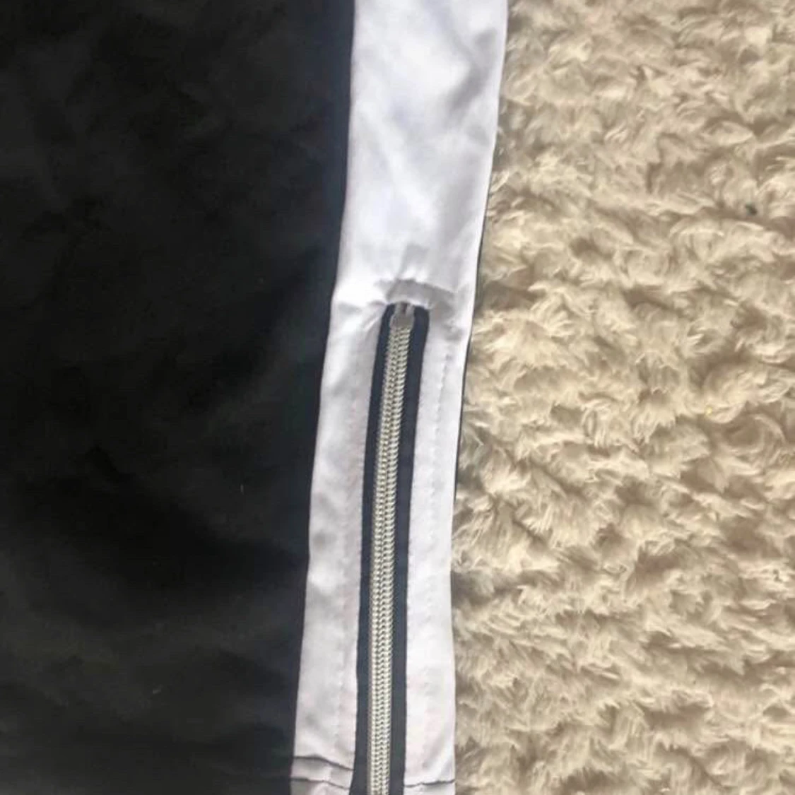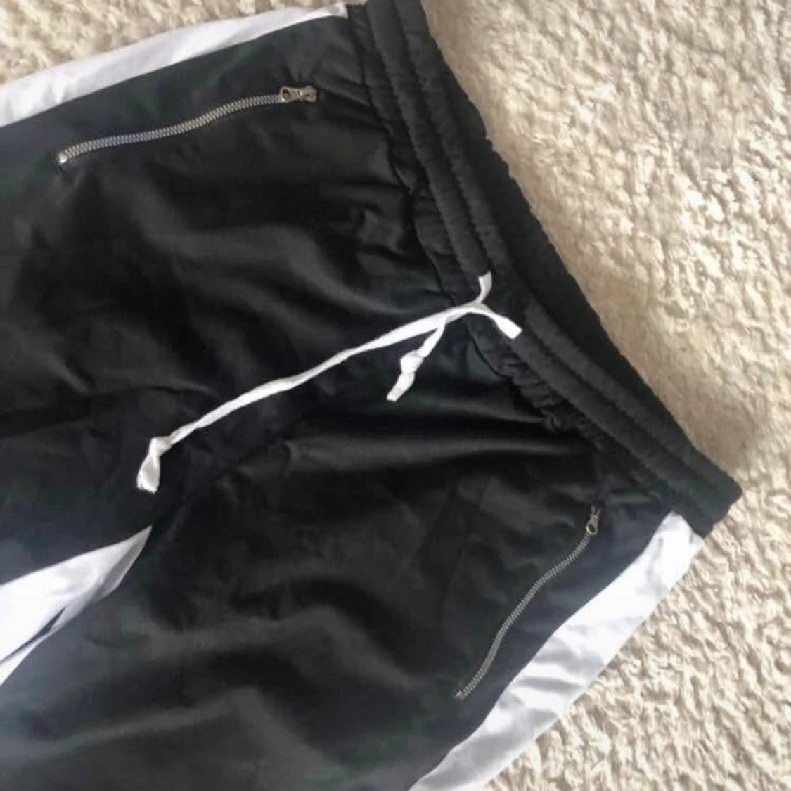 Svarta täckbyxor med breda vita ränder längs sidorna, snörning i midjan och dragkedjor både vid fickorna och vid bensluten. Byxorna har en sportig look och är gjorda i ett glansigt syntetmaterial som känns lätt och smidigt.