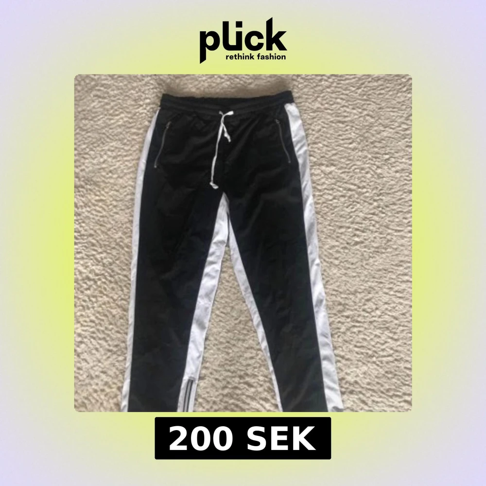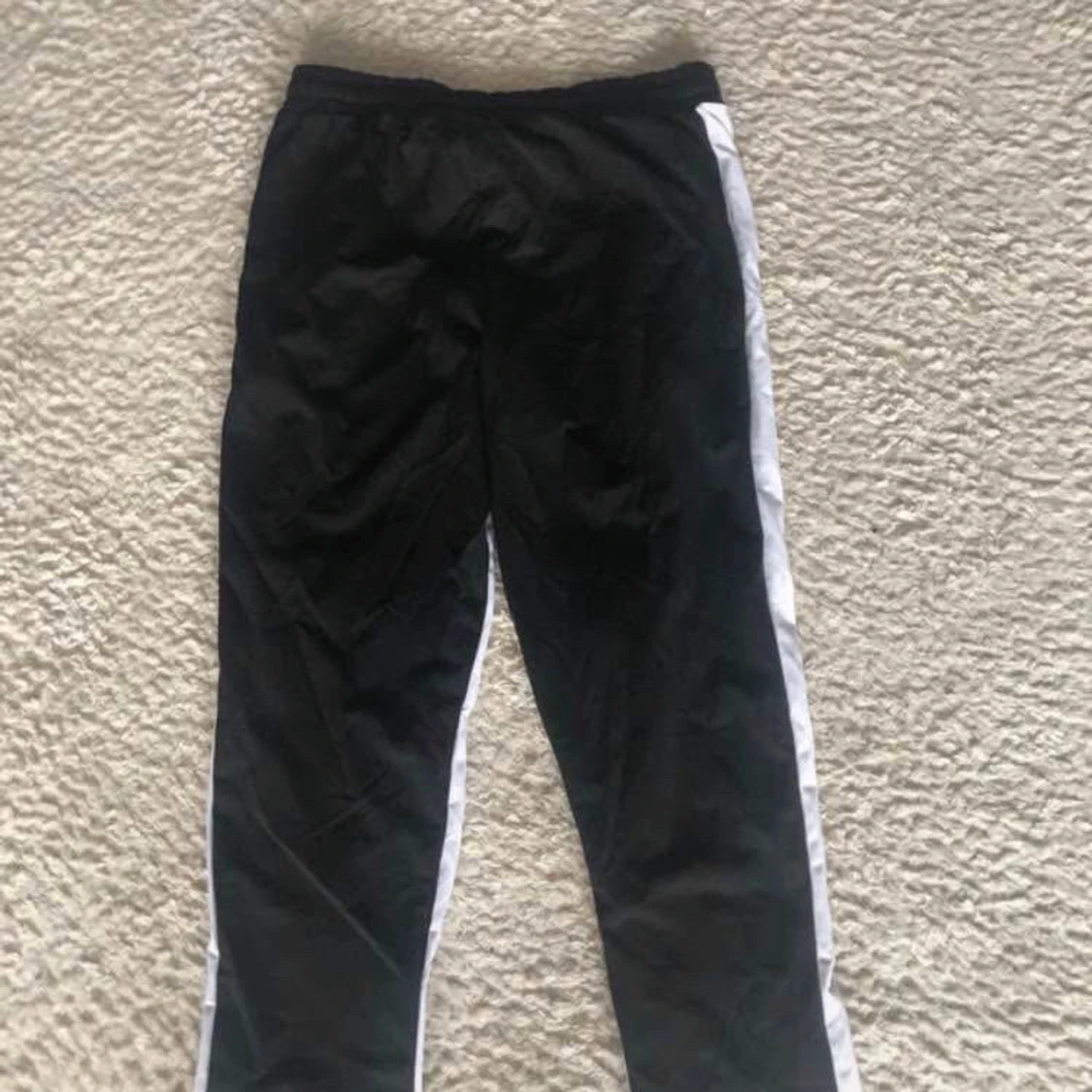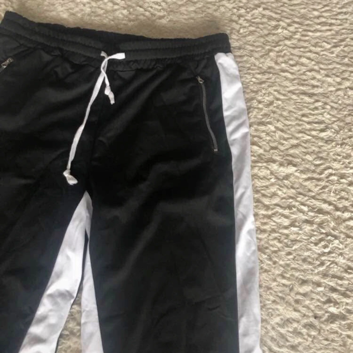 Svarta täckbyxor med breda vita ränder längs sidorna, snörning i midjan och dragkedjor både vid fickorna och vid bensluten. Byxorna har en sportig look och är gjorda i ett glansigt syntetmaterial som känns lätt och smidigt.