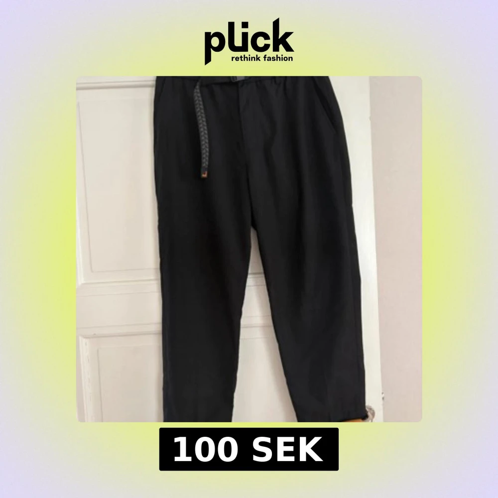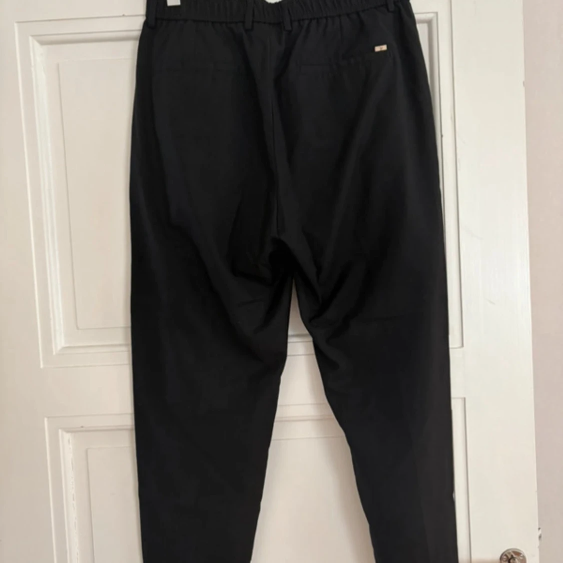 Svarta byxor i tapered modell med elastisk midja och justerbart bälte med spänne. Tillverkade i 80% polyester och 20% viskos, vilket ger en mjuk och lätt känsla. Fickor i sidorna och bak, perfekt för en chill och stilren look.