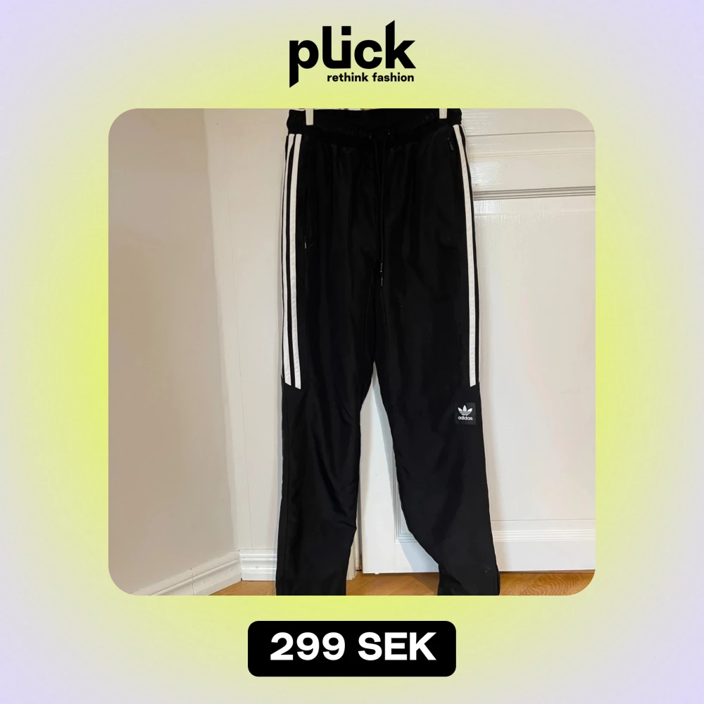 Säljer ett par svarta träningsbyxor från Adidas i mycket bra skick. De har de klassiska vita ränderna längs sidorna och en bekväm resårmidja med snörning. Perfekta för träning eller en avslappnad dag. Adidas-loggan syns på ena benet. Passar till både höst och vår.